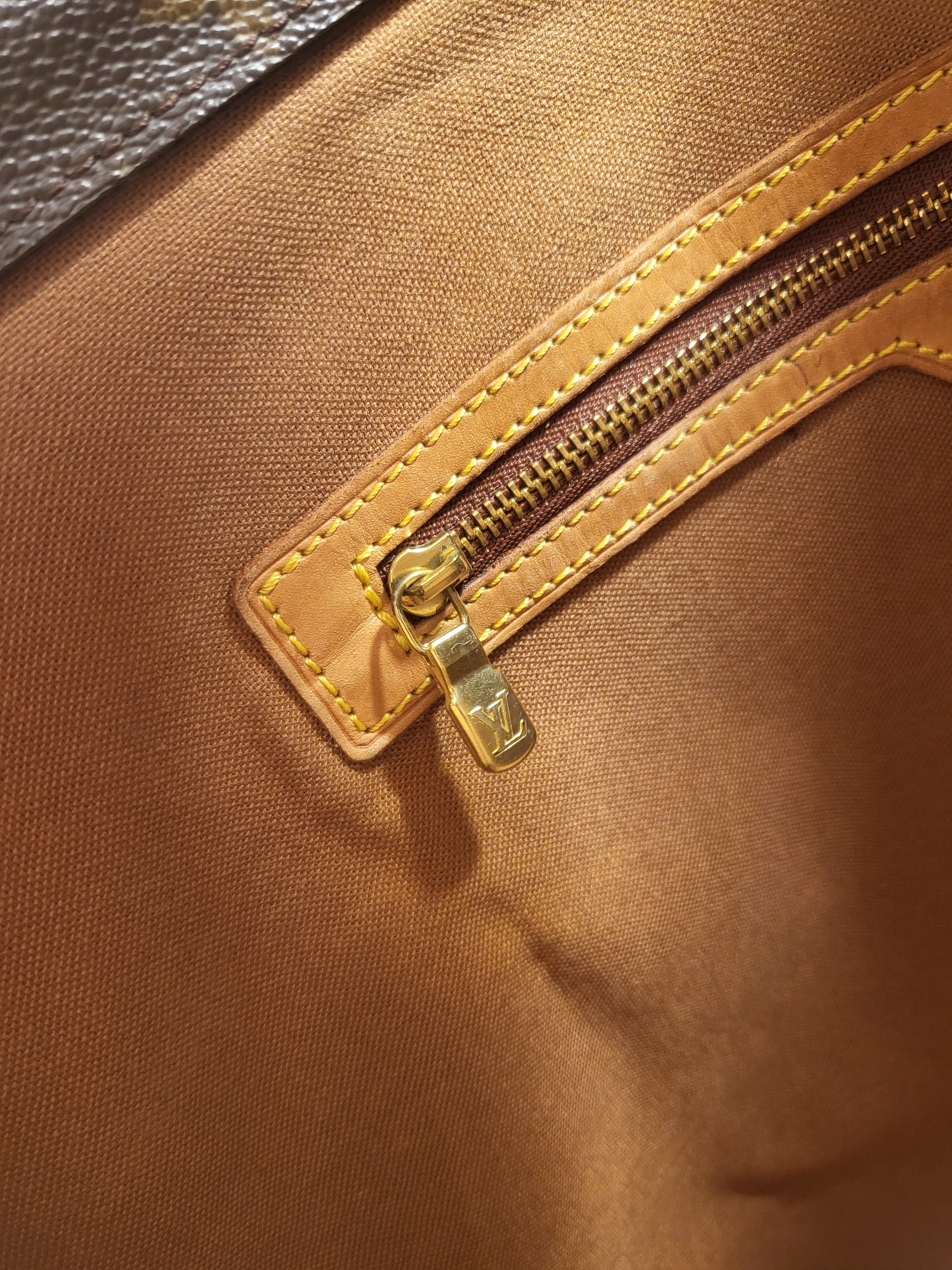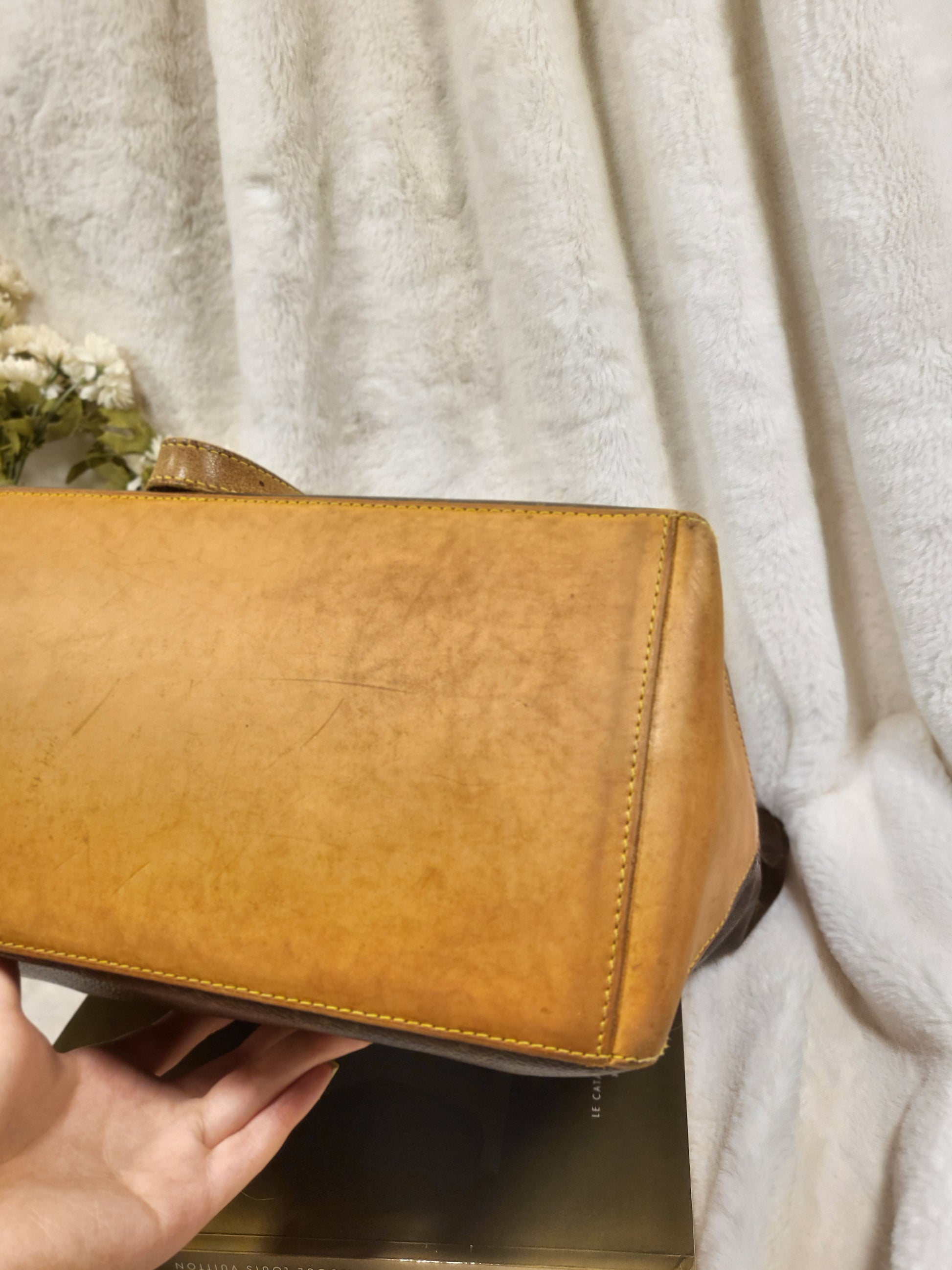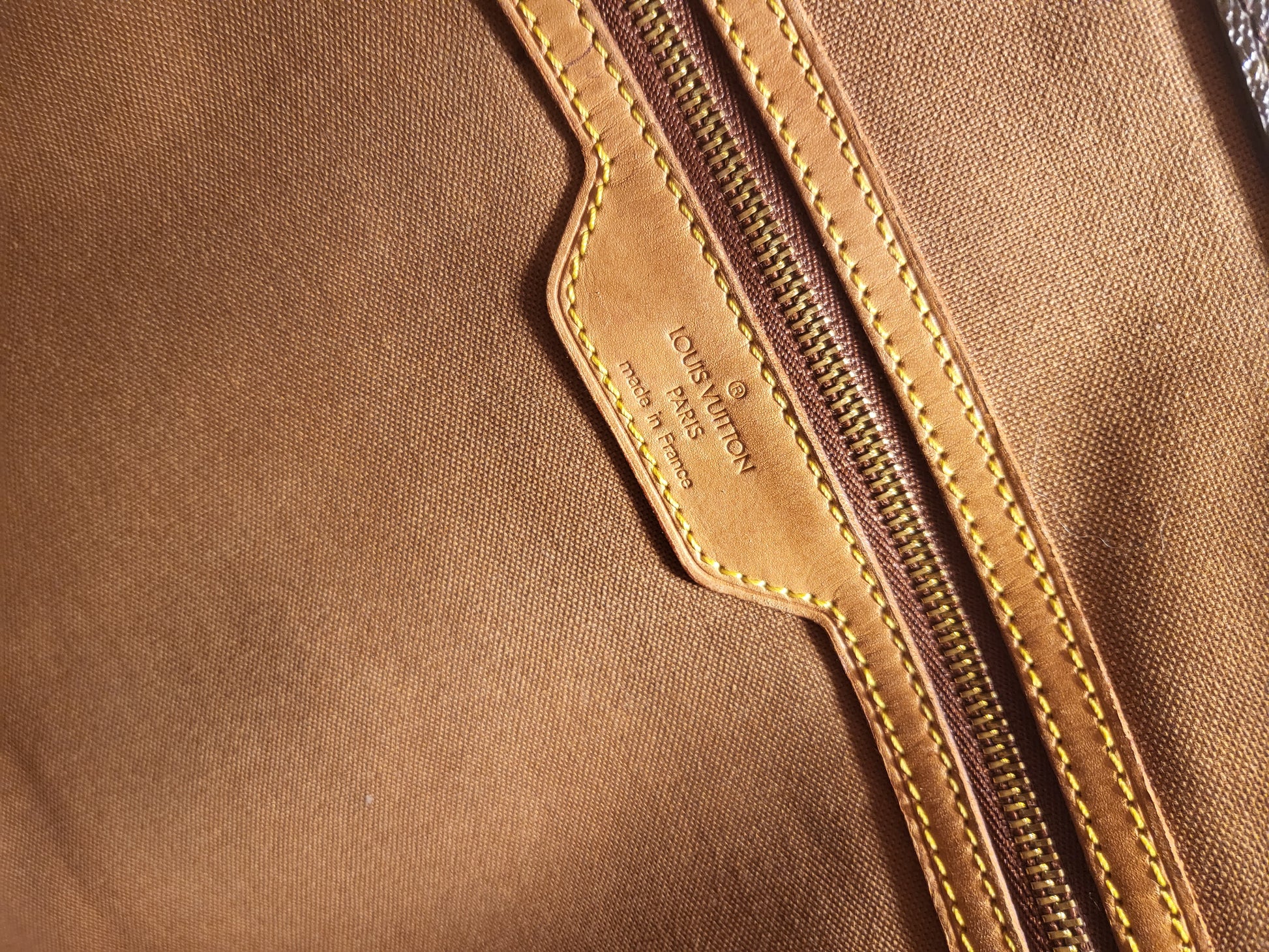 monogram canvas is still in great shape, it has a beautiful vibrant color, free of cracks or any fading. Vachetta leather on the bottom shows a rather even patina, with some minor marks and surface scratches. Some water marks noticed. Shoulder chaps all in tact and hold firmly. Strap backside shows minor water marks