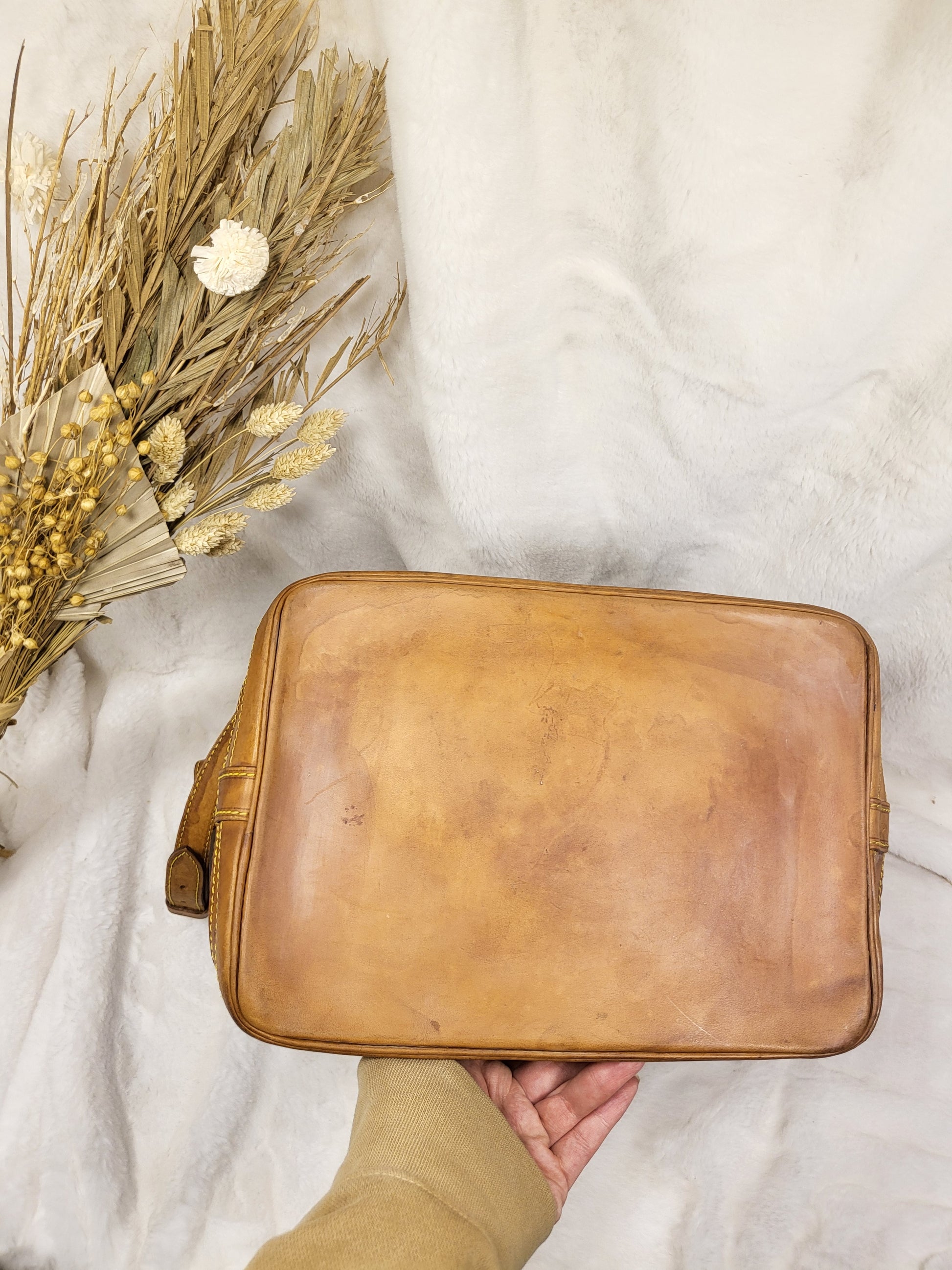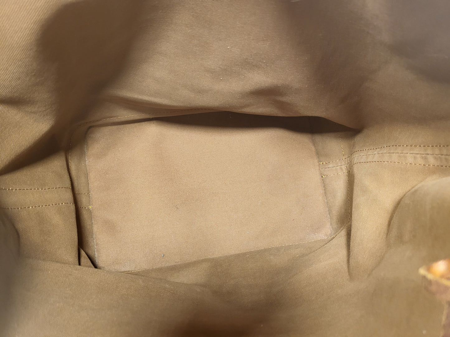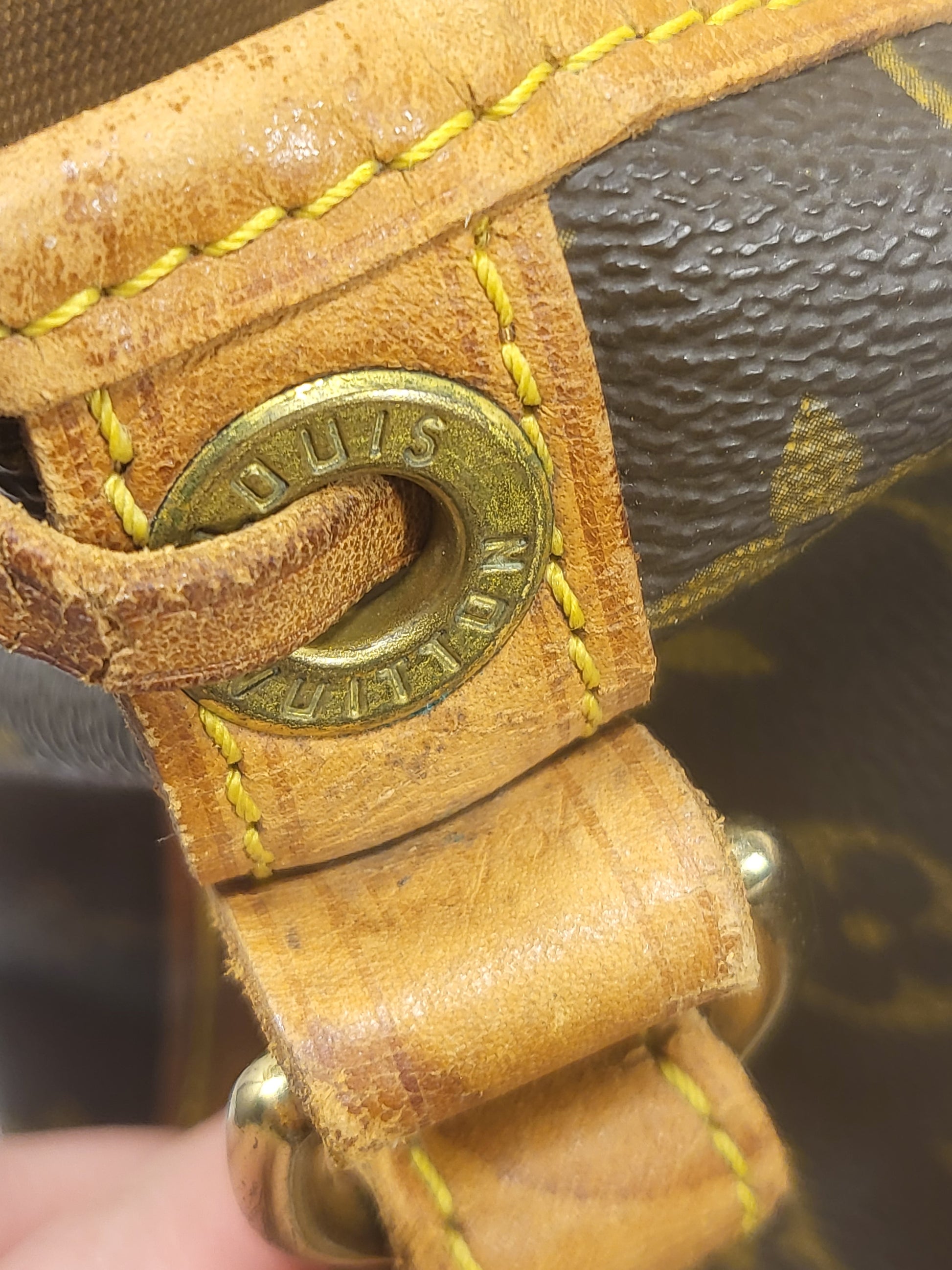 Vachetta leather has darkened, shows signs of dryness, watermarks and cracks on leather. Leather trim shows color unevenness and small cuts, all pipings are intact