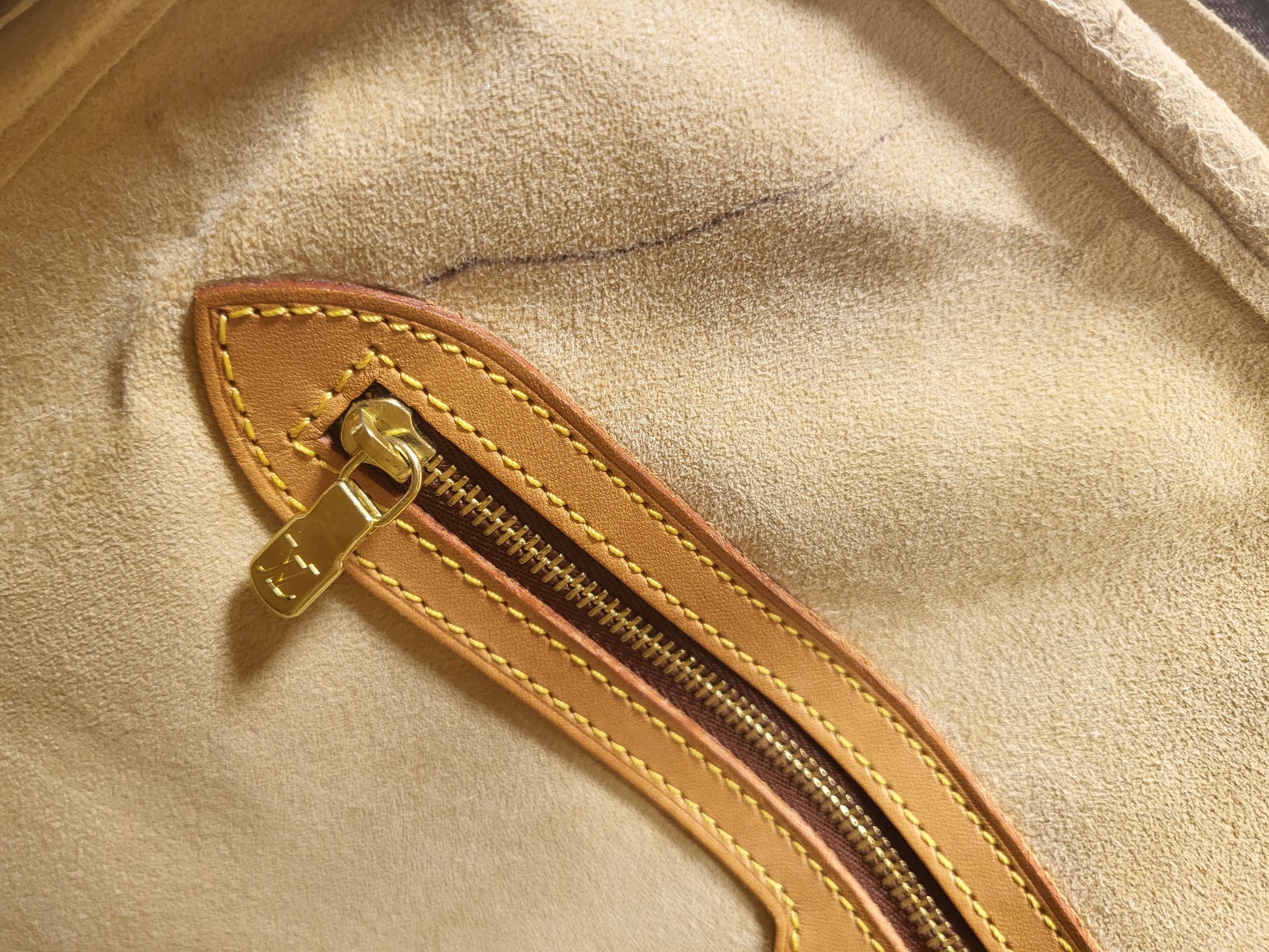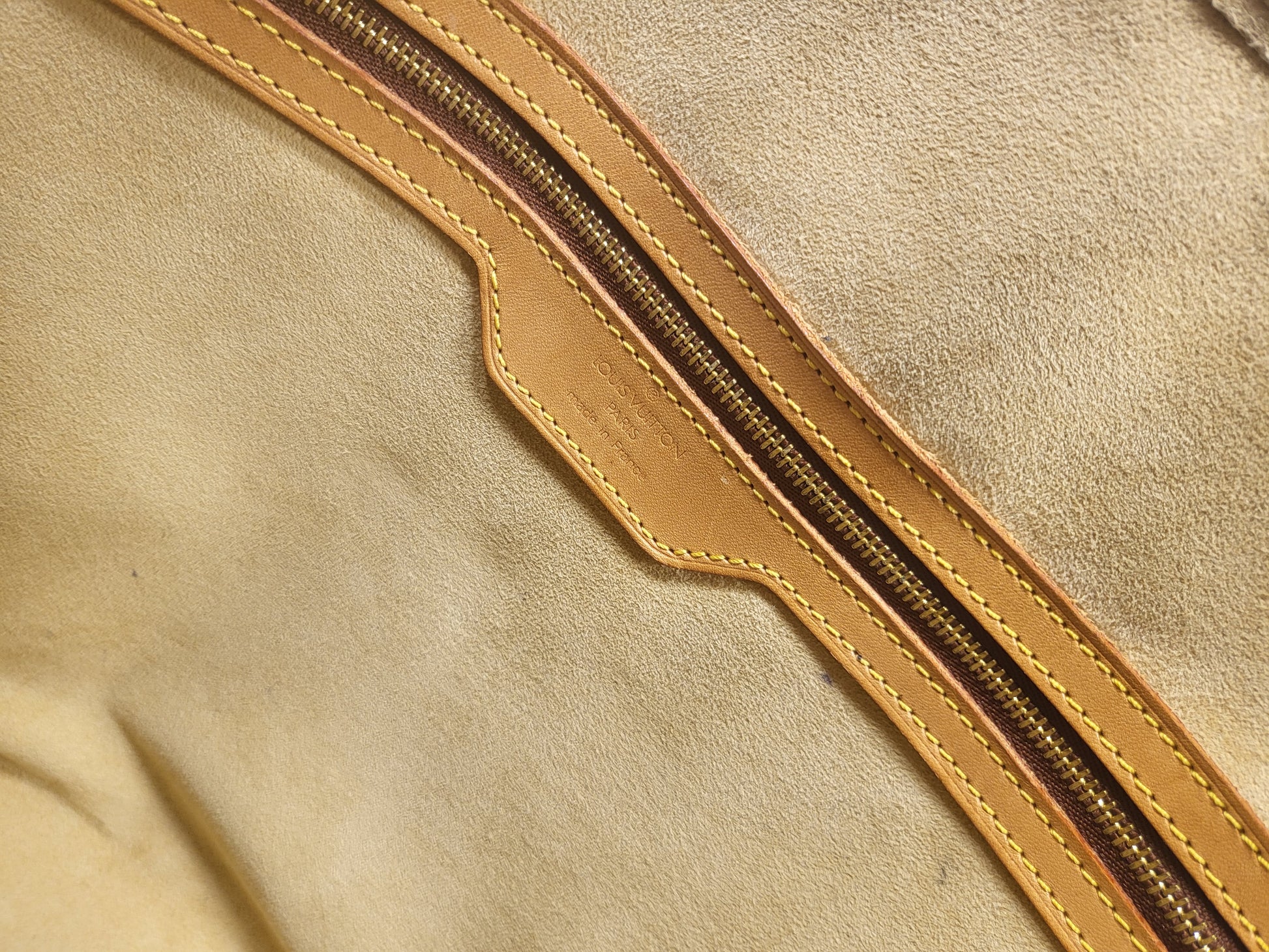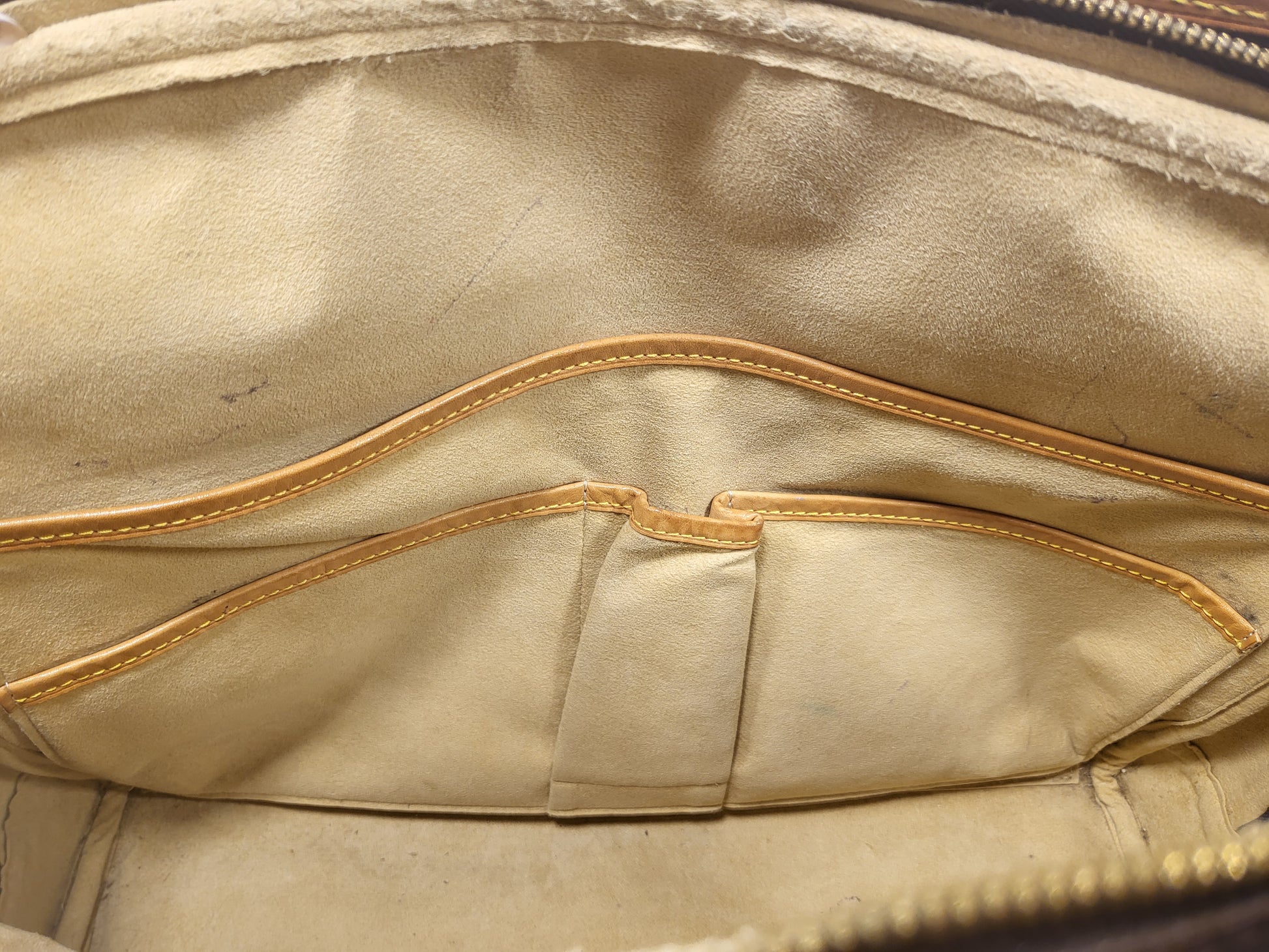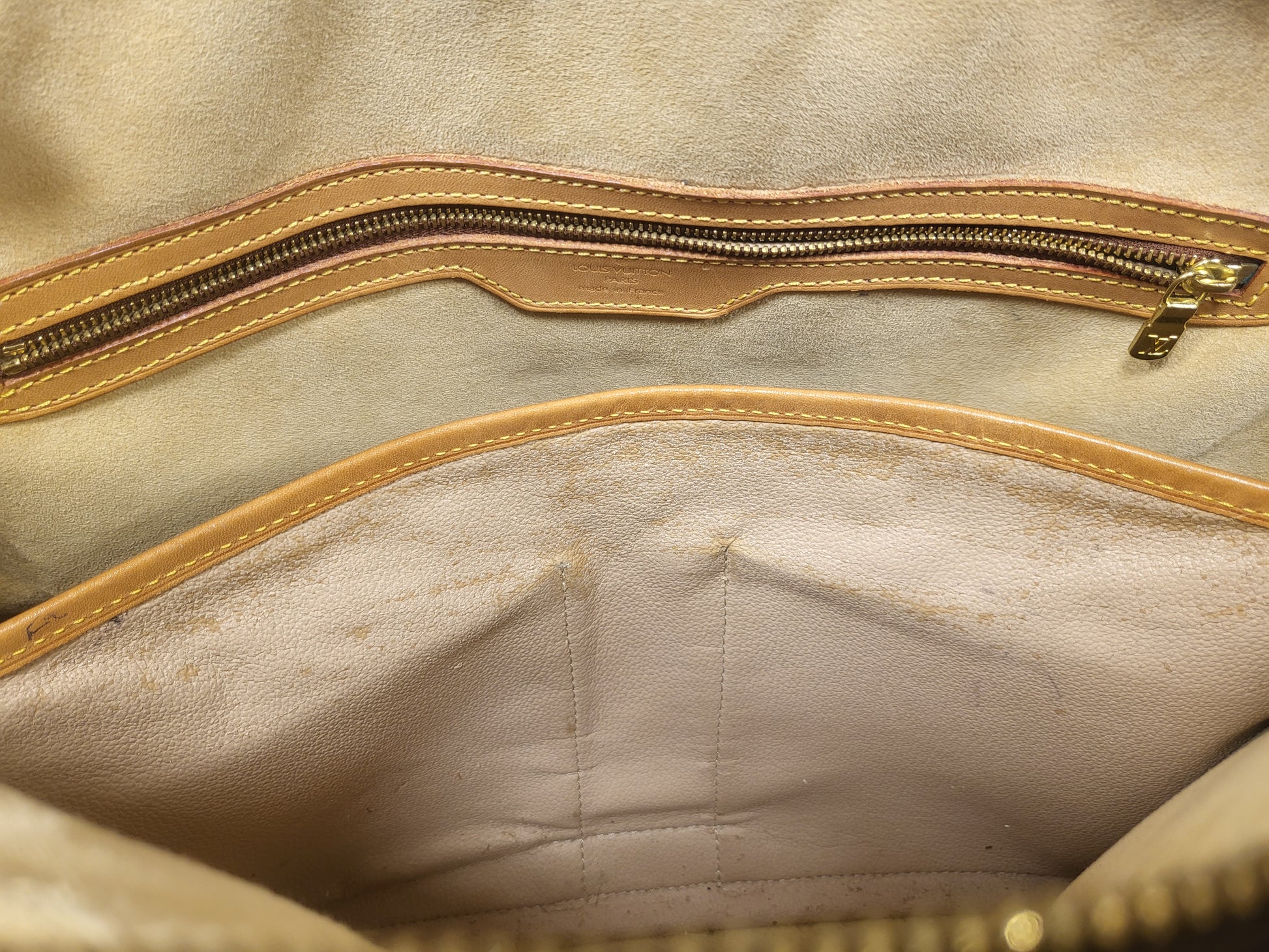 Gorgeous monogram canvas and vachetta leather, no cracks or fading noticed on canvas, vachetta leather is also in beautiful condition, it has a nice patina with no exposed pipings or cracked leather parts, handels are very sturdy as well as the chaps. All gold hardware are shiny and golden, zippers work properly and smoothly.