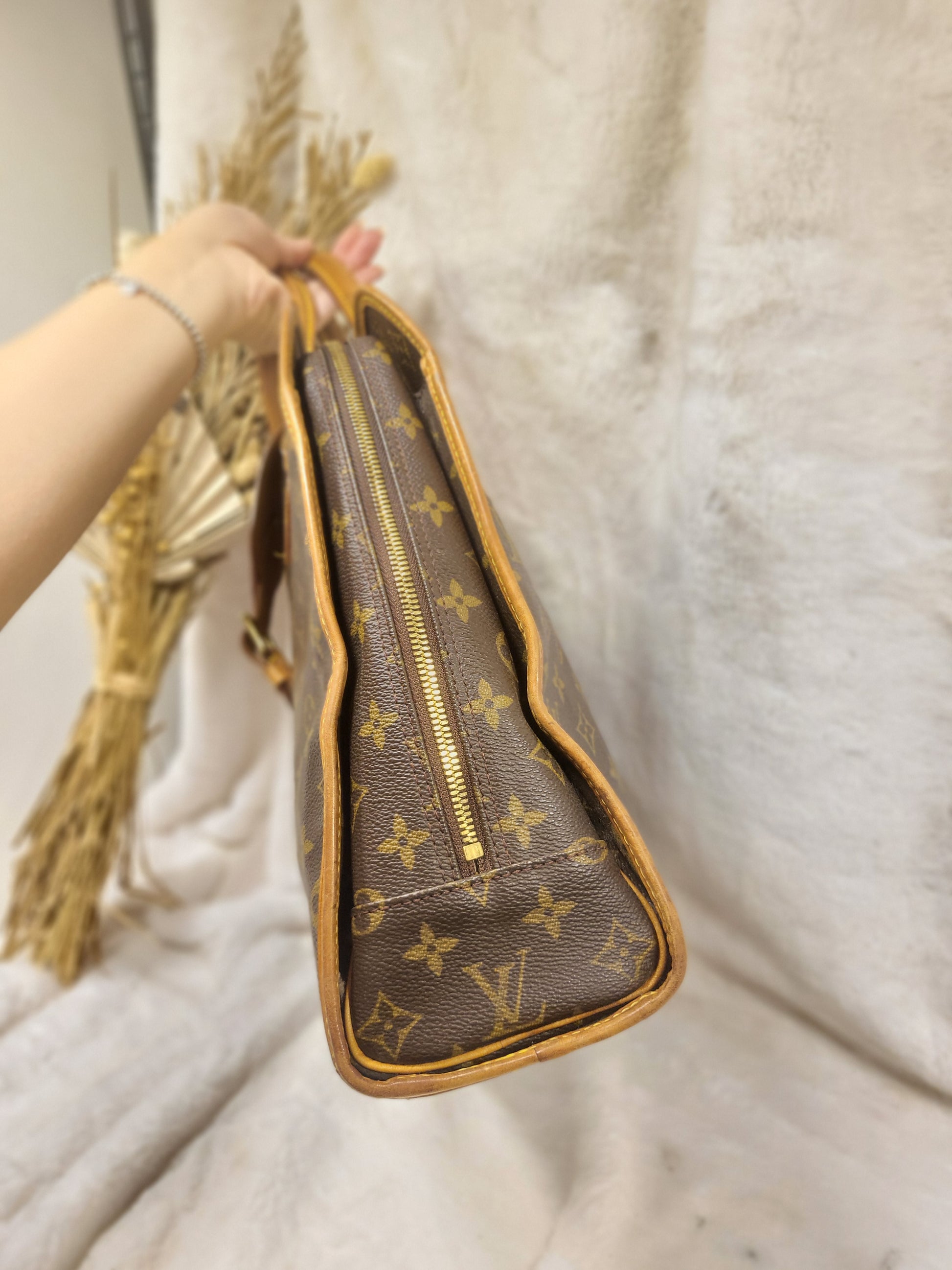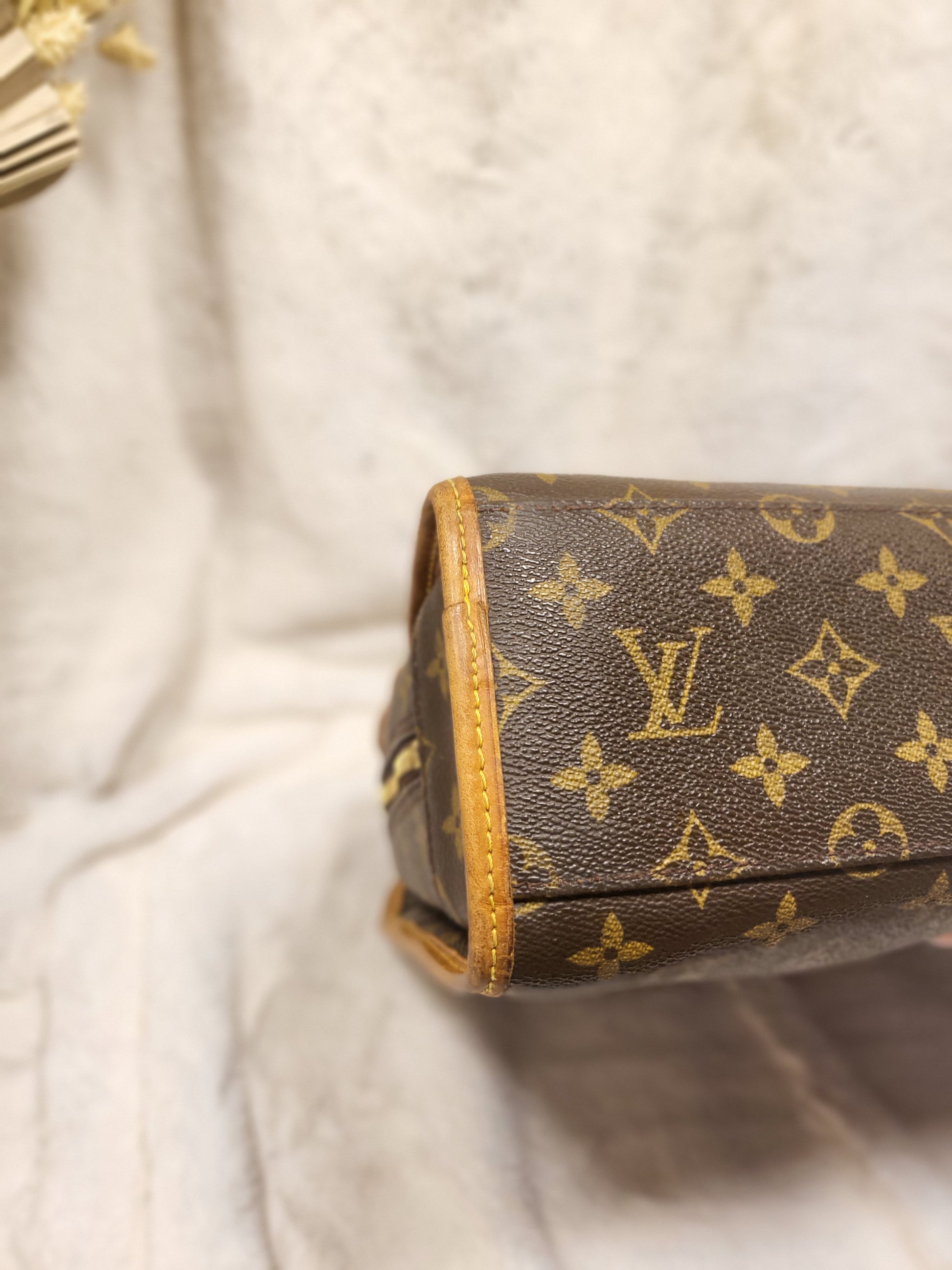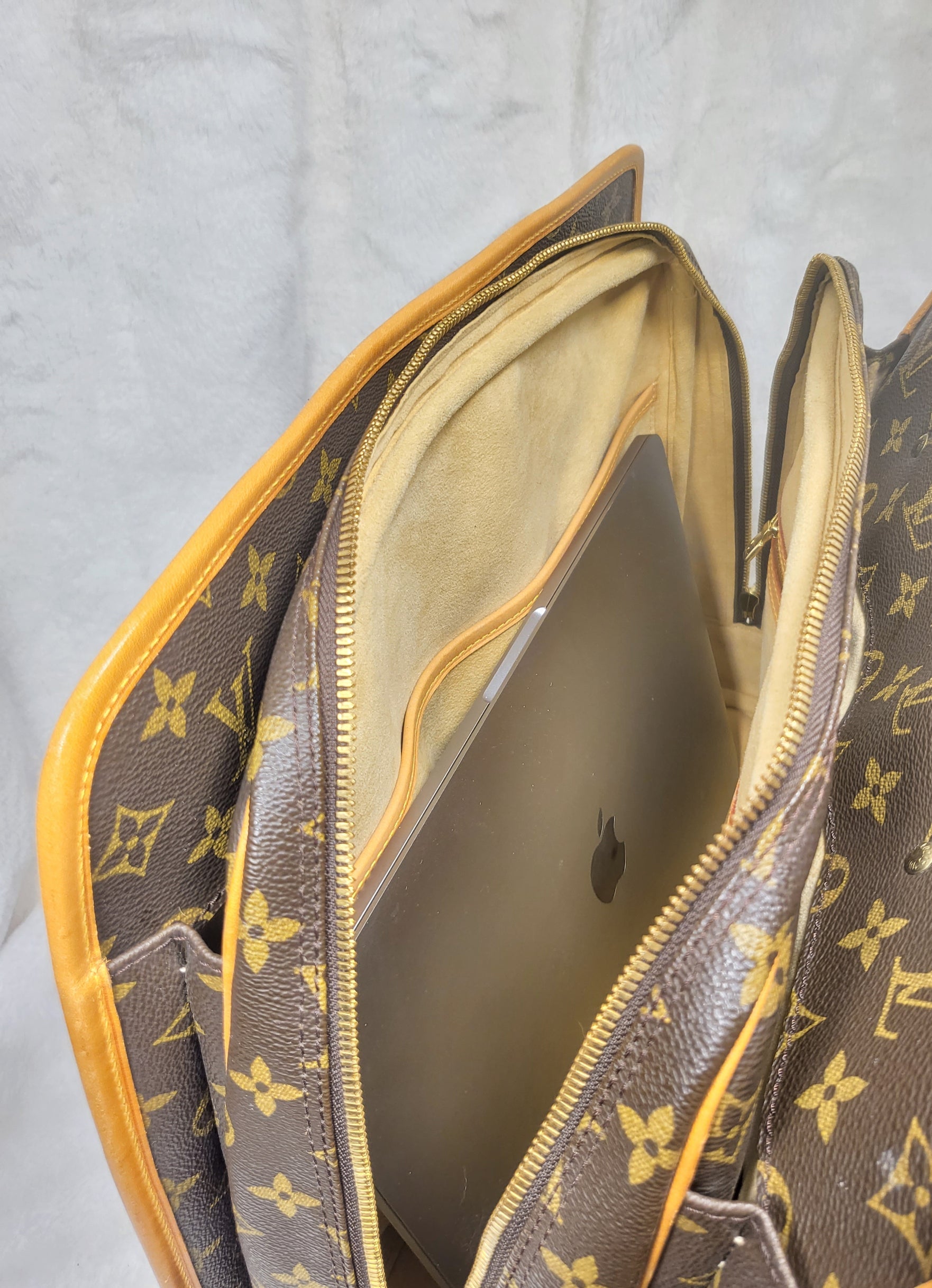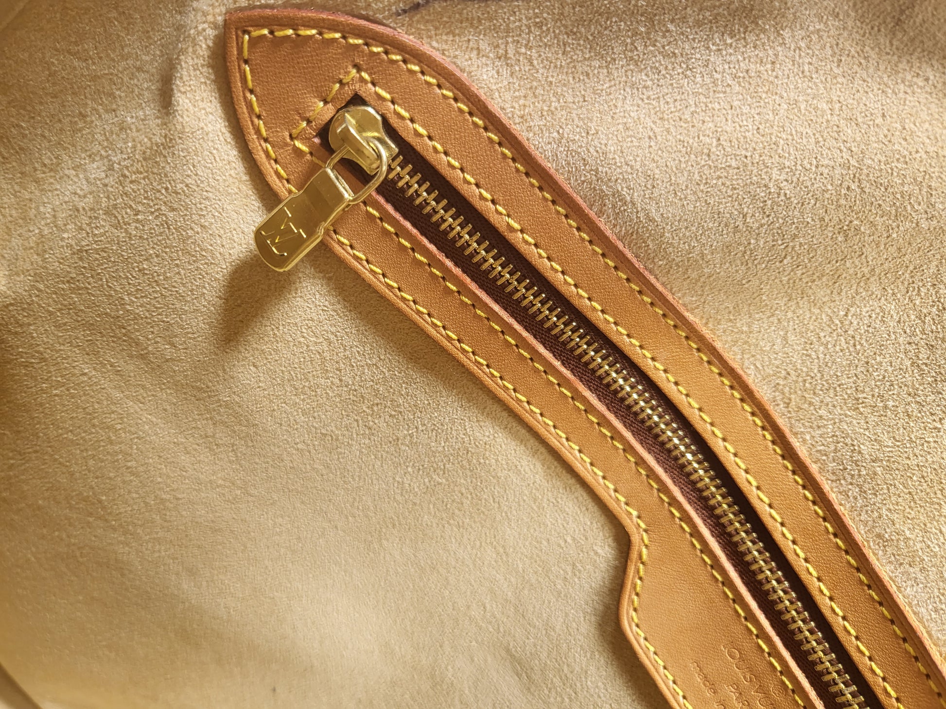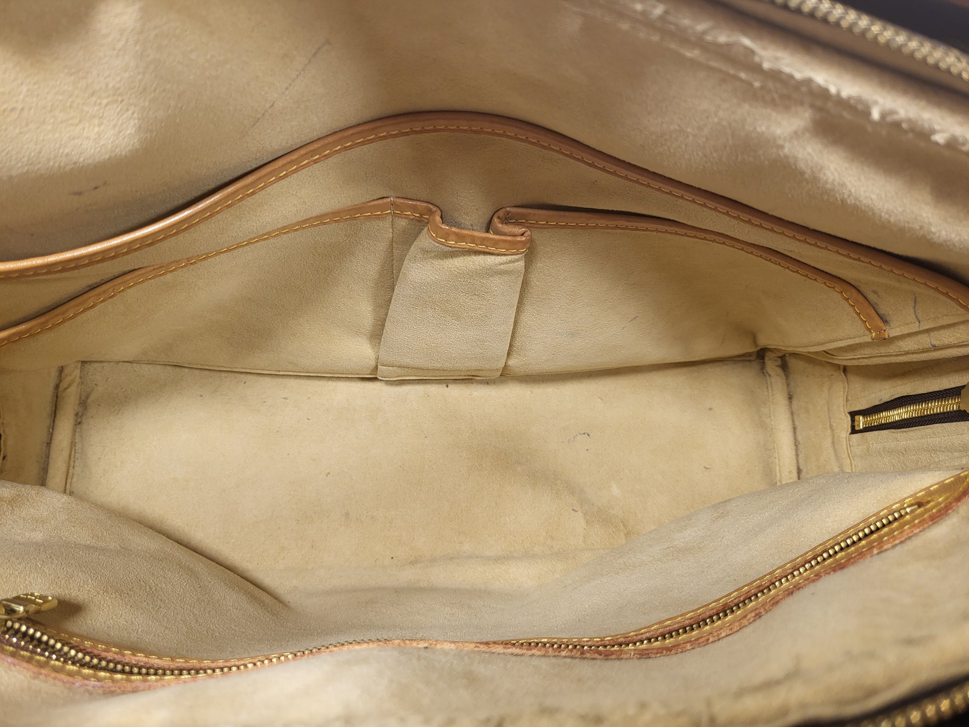 Gorgeous monogram canvas and vachetta leather, no cracks or fading noticed on canvas, vachetta leather is also in beautiful condition, it has a nice patina with no exposed pipings or cracked leather parts, handels are very sturdy as well as the chaps. All gold hardware are shiny and golden, zippers work properly and smoothly.