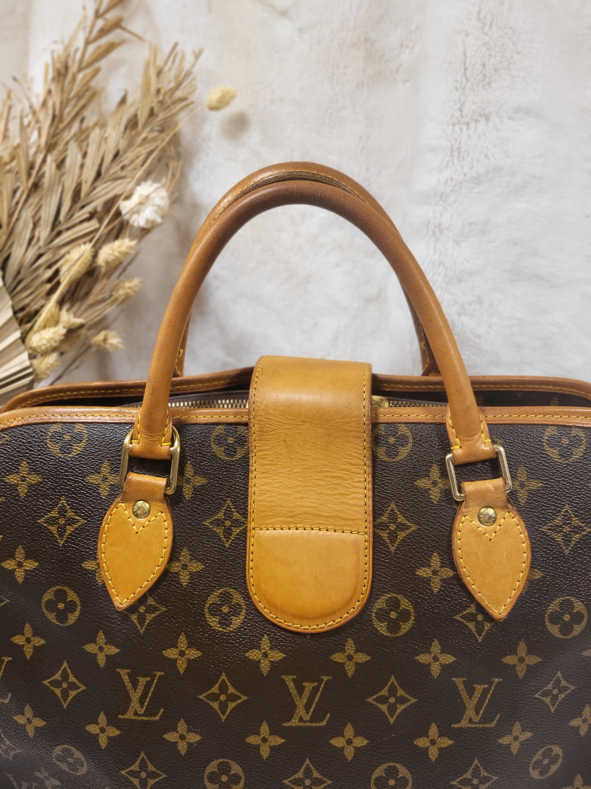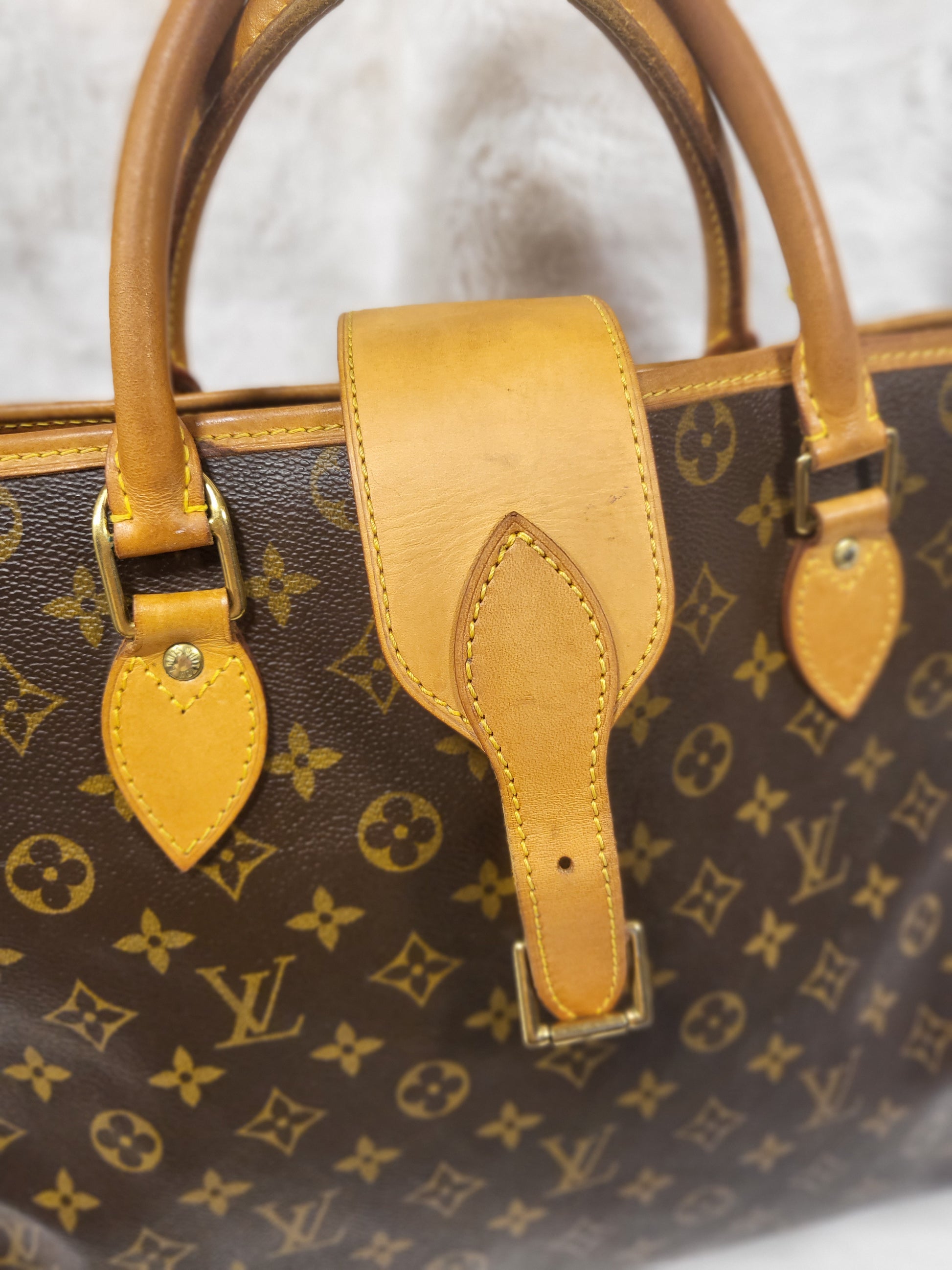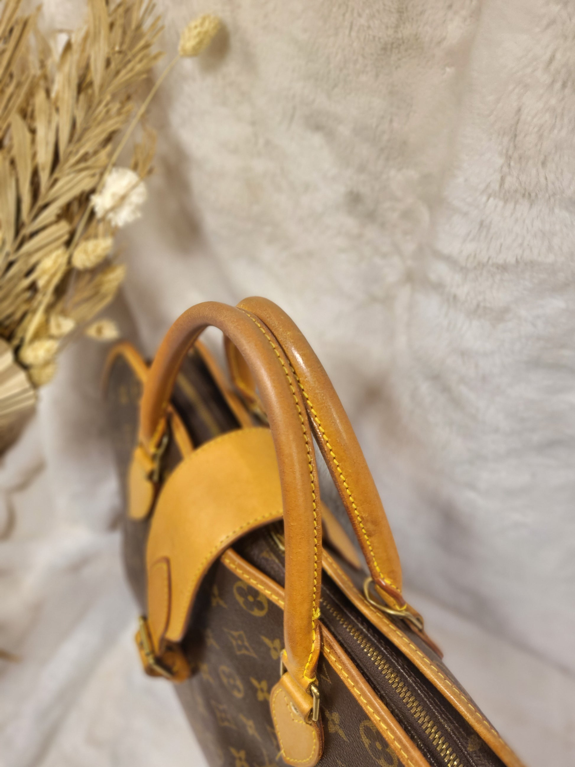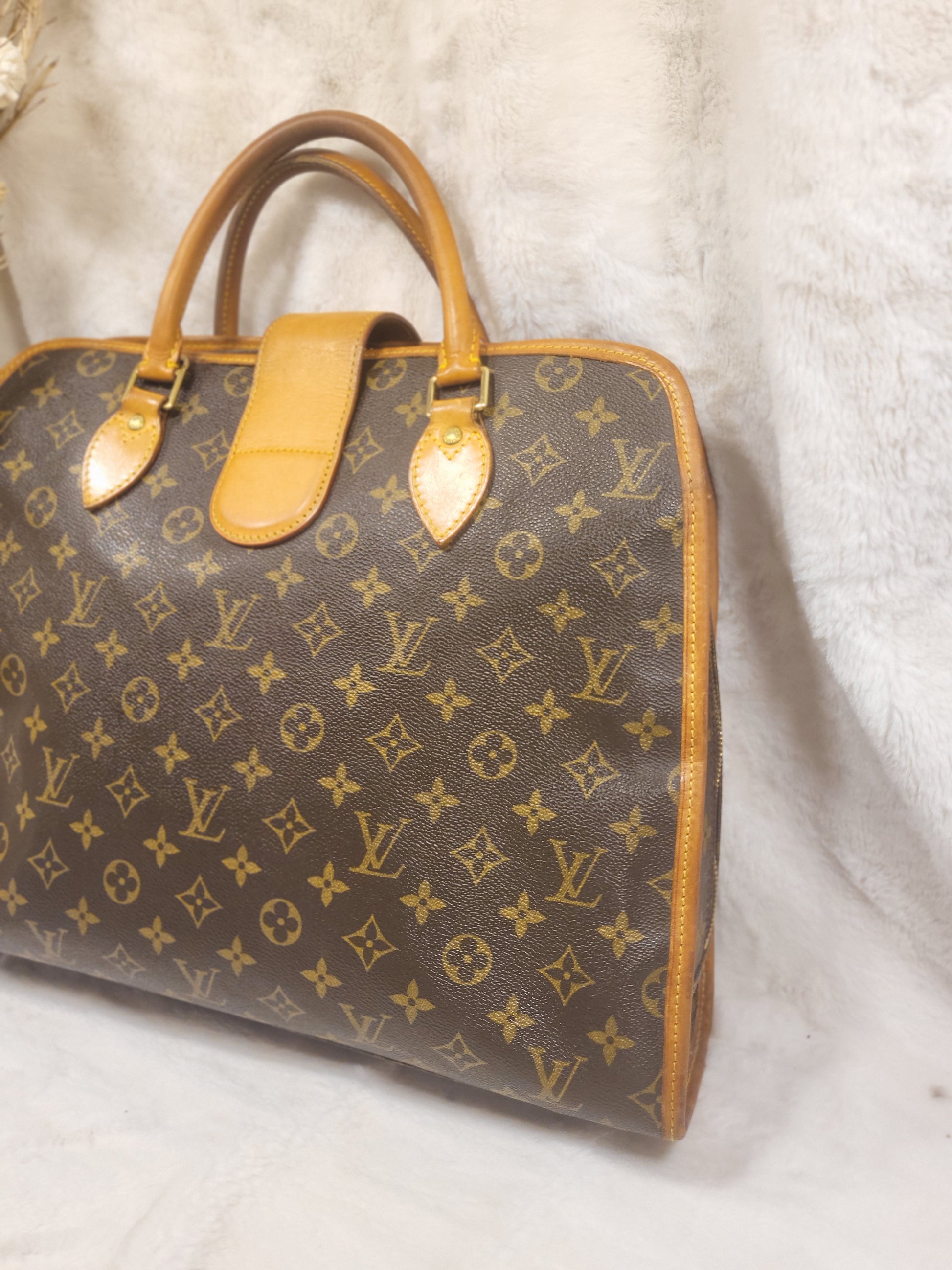 Gorgeous monogram canvas and vachetta leather, no cracks or fading noticed on canvas, vachetta leather is also in beautiful condition, it has a nice patina with no exposed pipings or cracked leather parts, handels are very sturdy as well as the chaps. All gold hardware are shiny and golden, zippers work properly and smoothly.