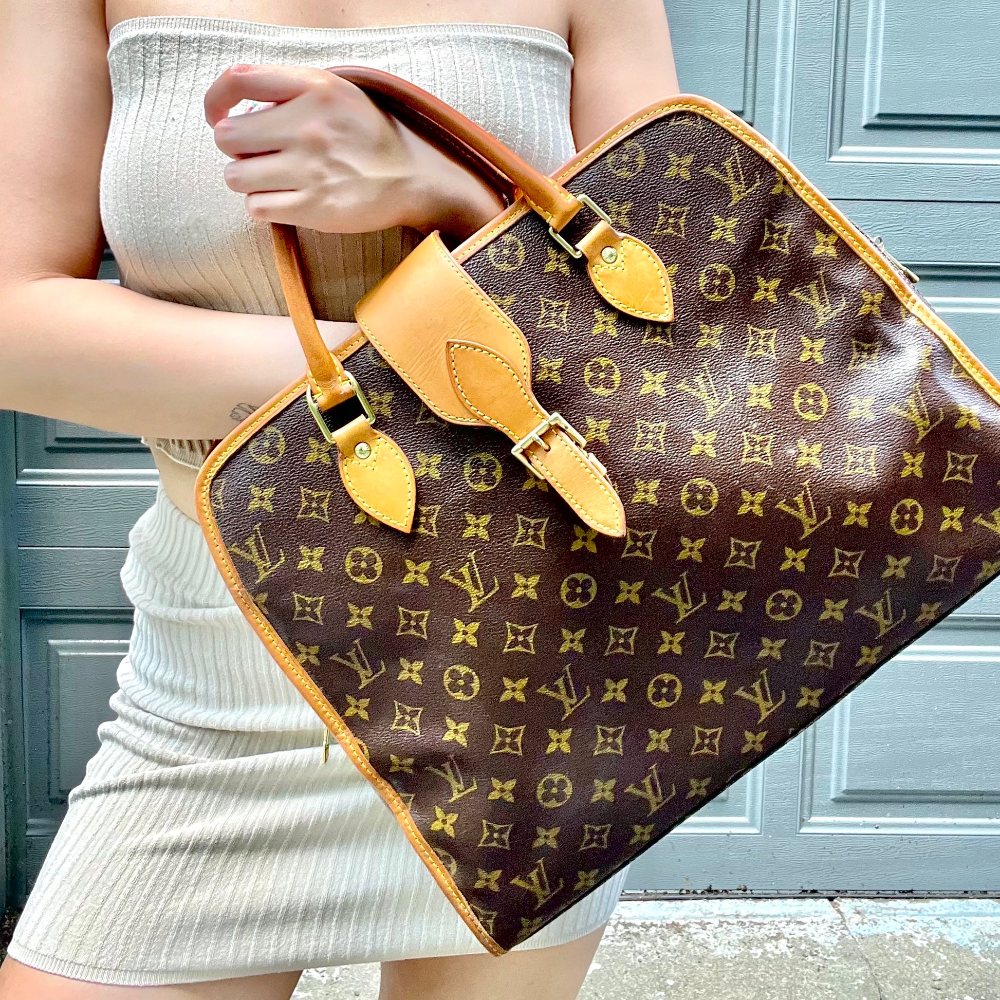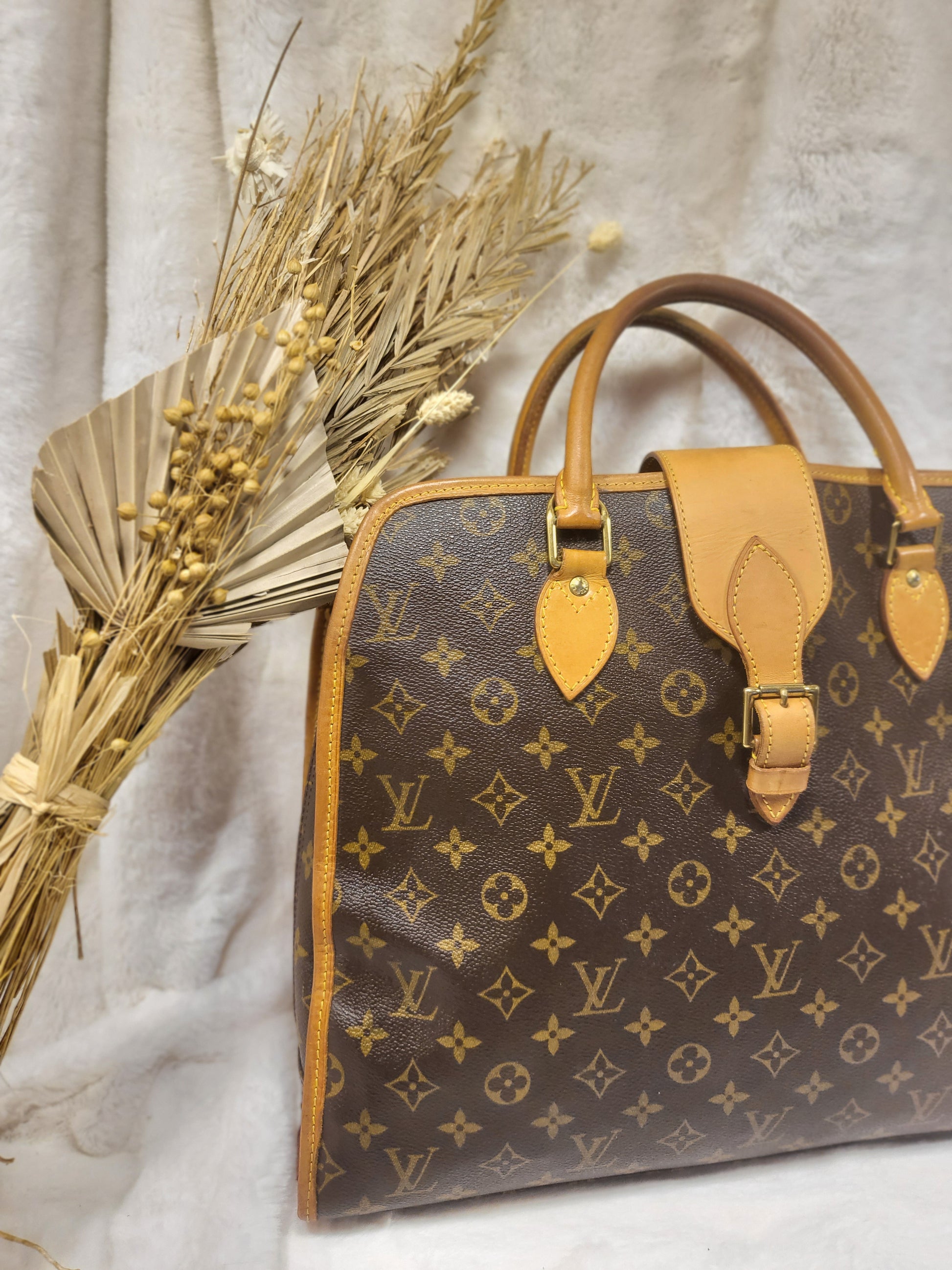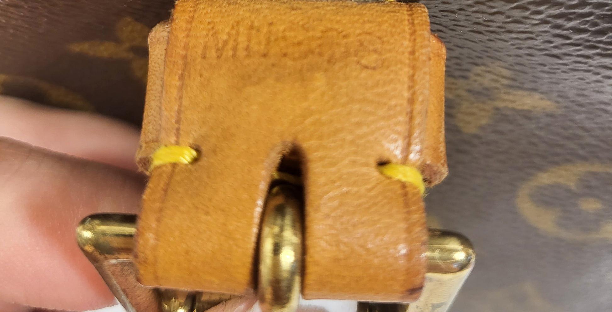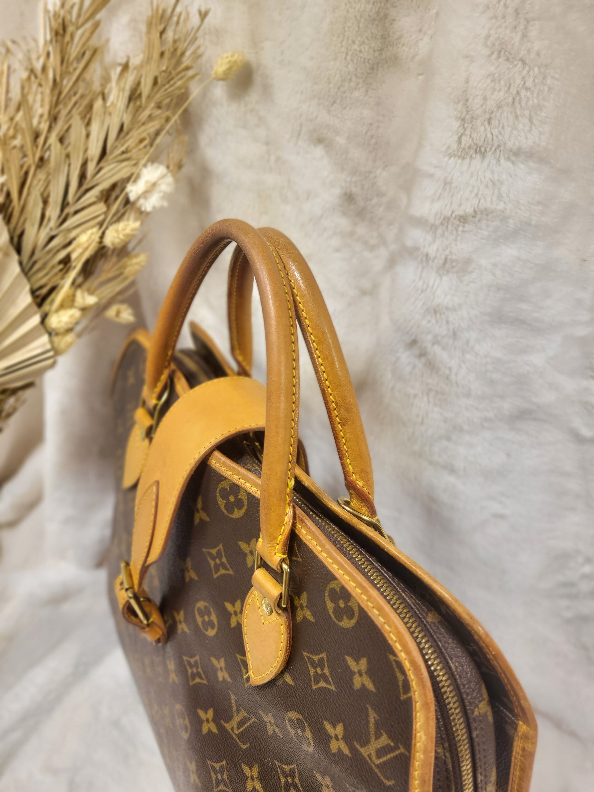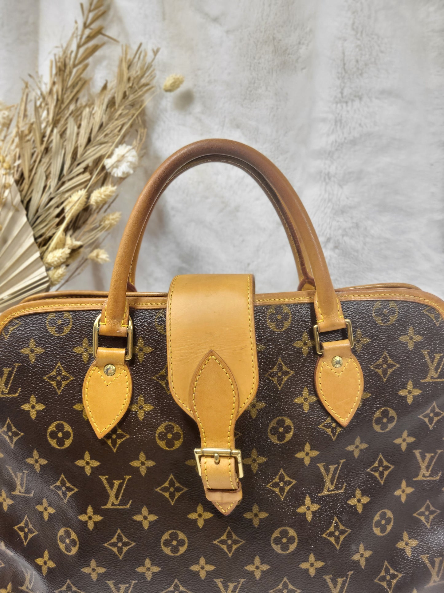 Gorgeous monogram canvas and vachetta leather, no cracks or fading noticed on canvas, vachetta leather is also in beautiful condition, it has a nice patina with no exposed pipings or cracked leather parts, handels are very sturdy as well as the chaps. All gold hardware are shiny and golden, zippers work properly and smoothly.