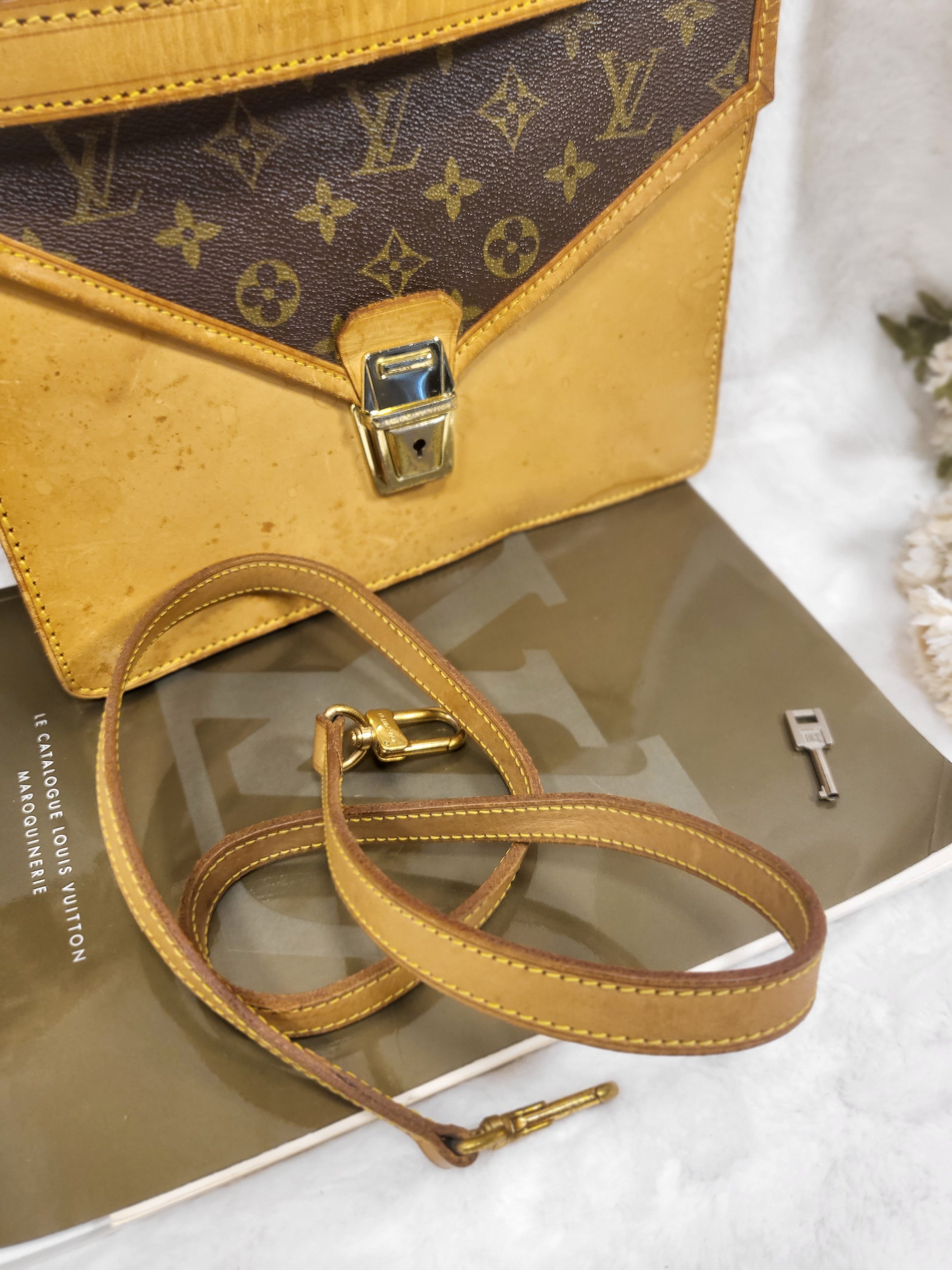Ultra rare vintage pre-date code model, this bag feathers double sided opening closure with buckle and lock on each side, the bag comes with one detachable handle, one detachable crossbody strap and it’s original key. The coolest part is the monogram canvas on the middle part between the two main compartments!