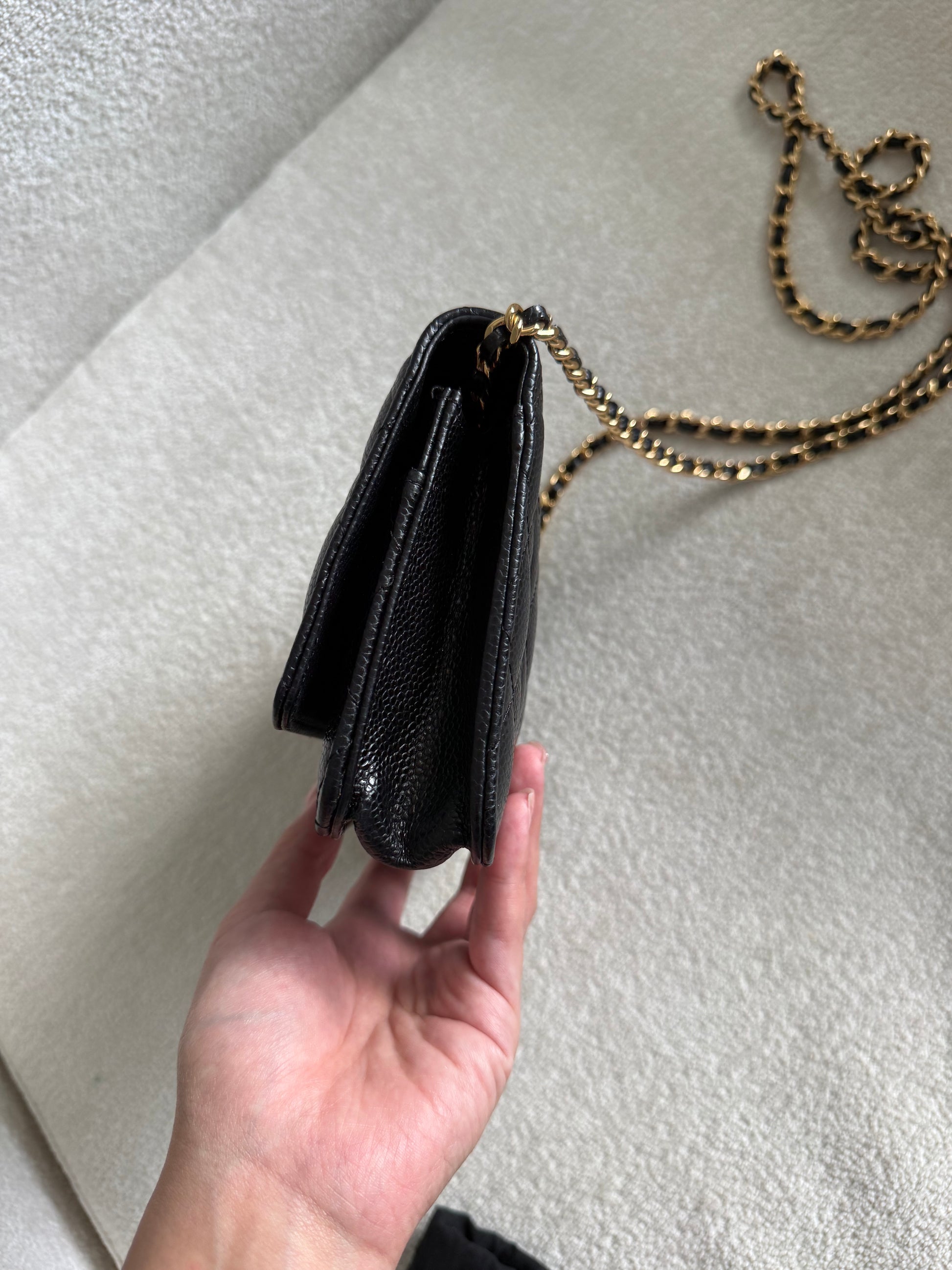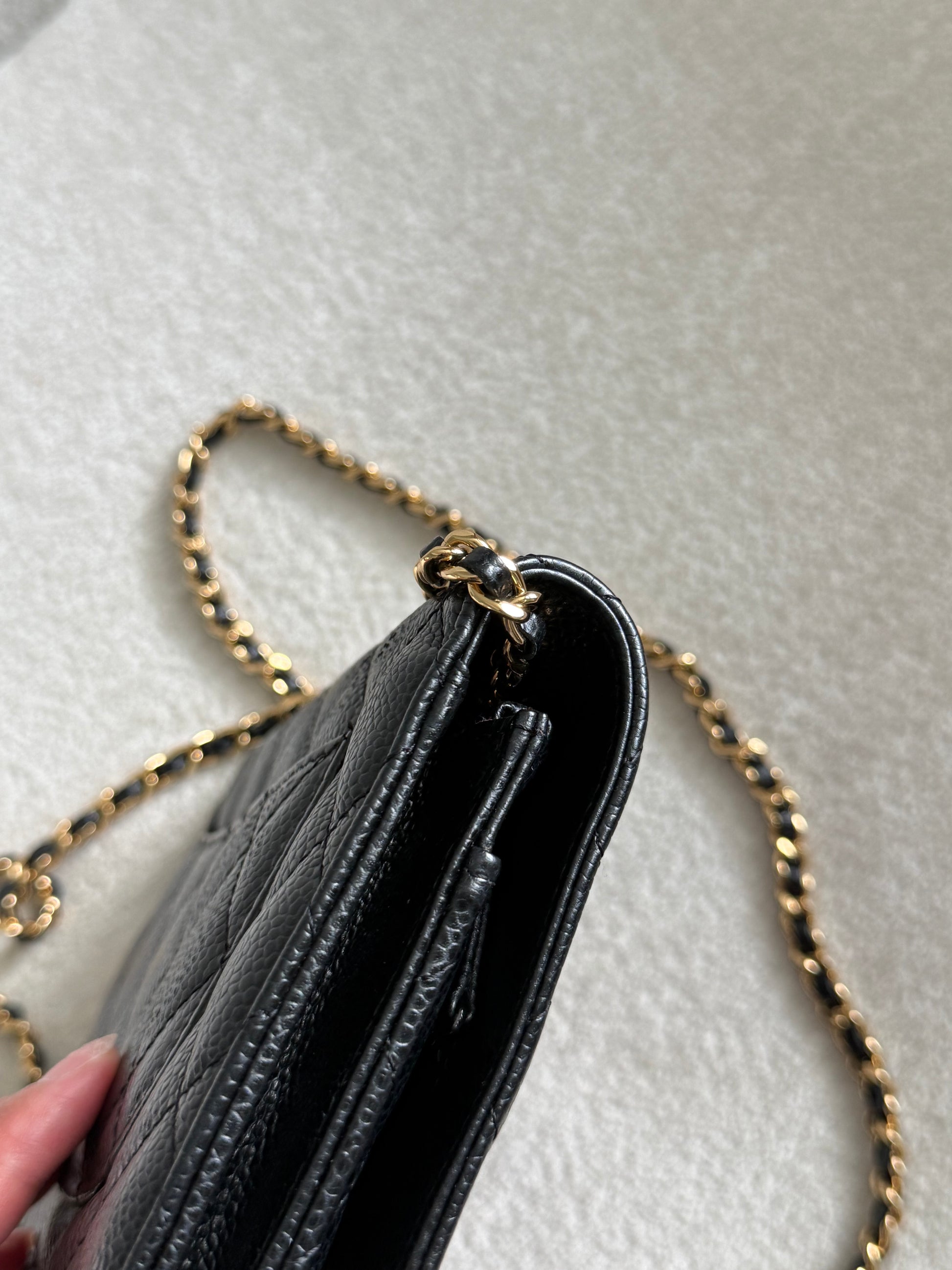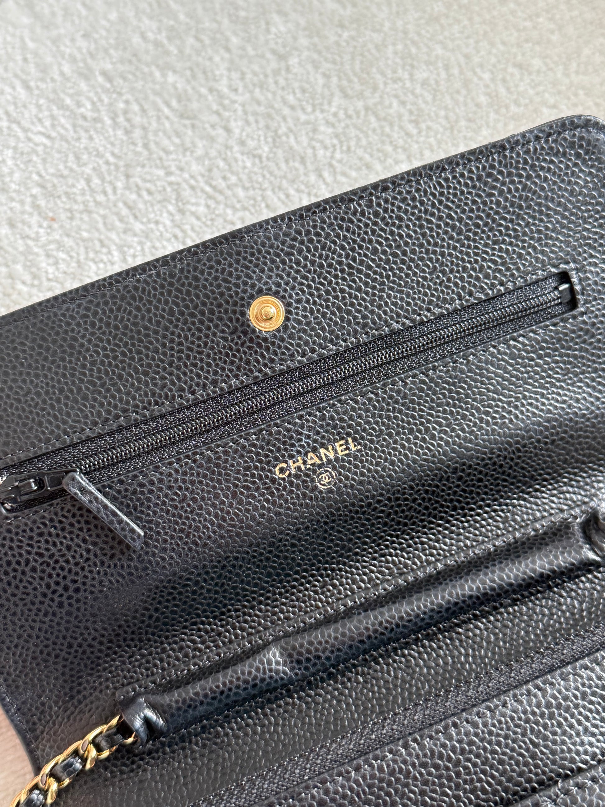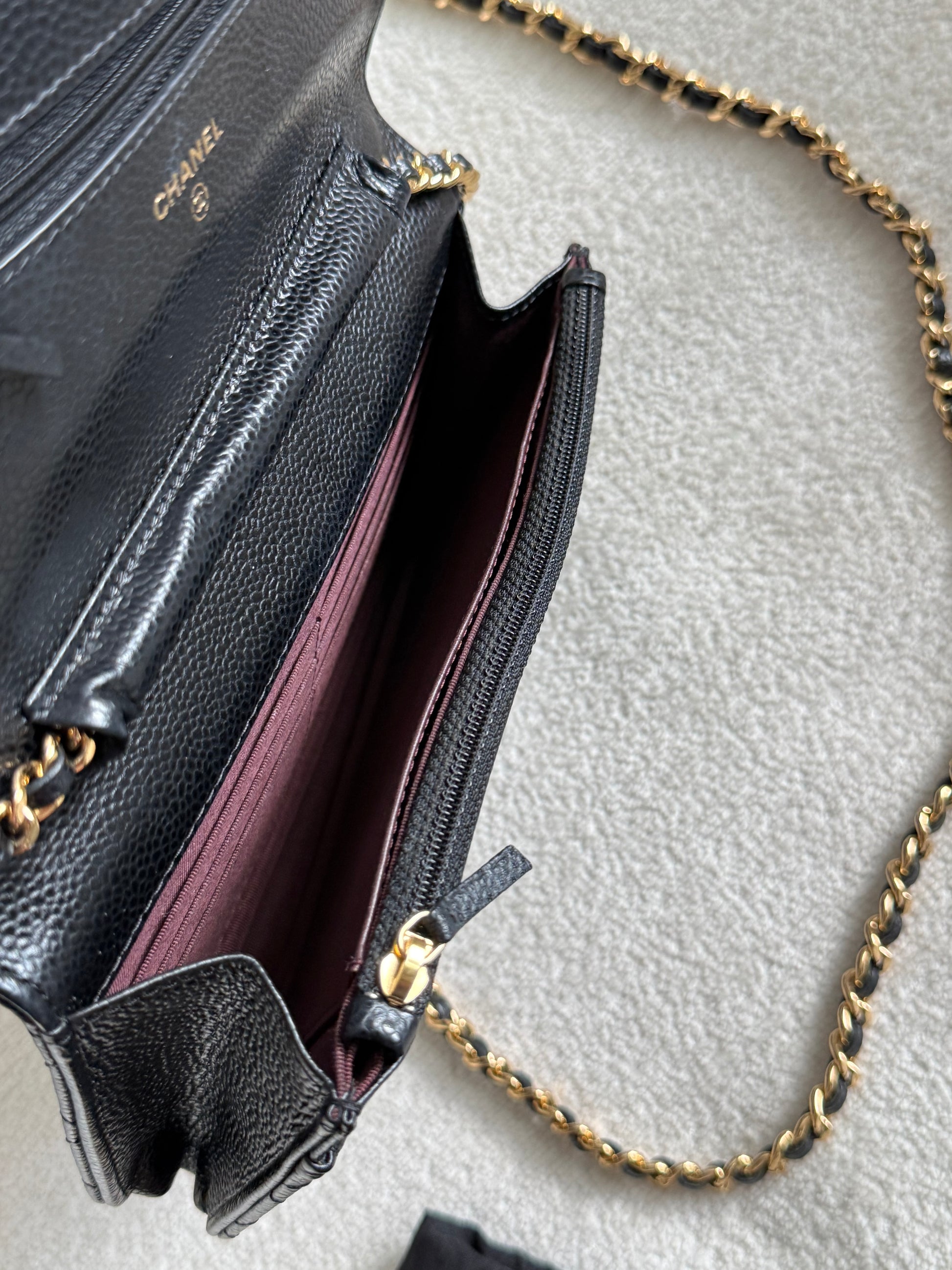 A timeless classic from Chanel, this Wallet on Chain (WOC) is crafted in luxurious black caviar leather and finished with elegant gold-tone hardware. The perfect blend of practicality and sophistication, this piece transitions effortlessly from day to night.