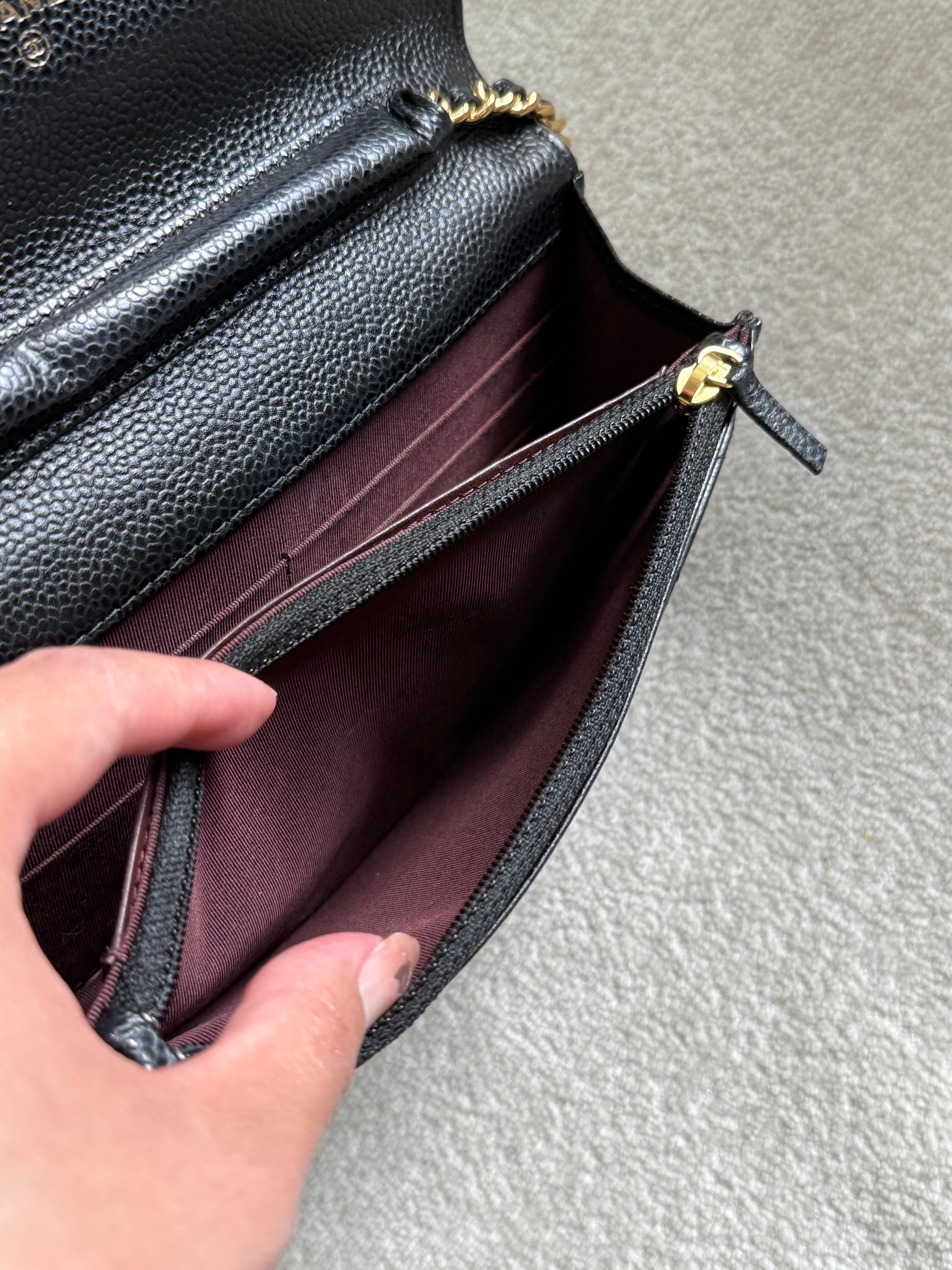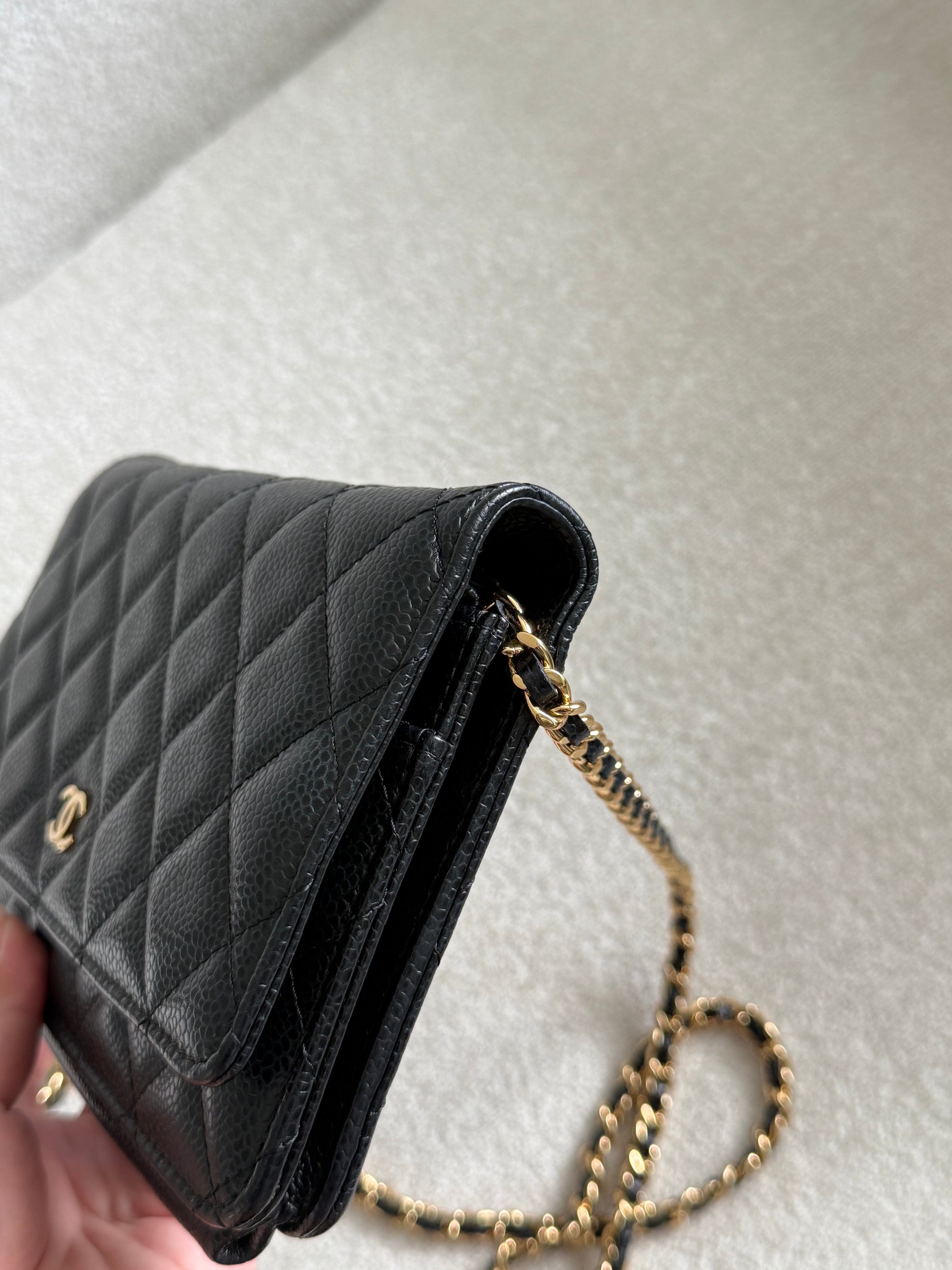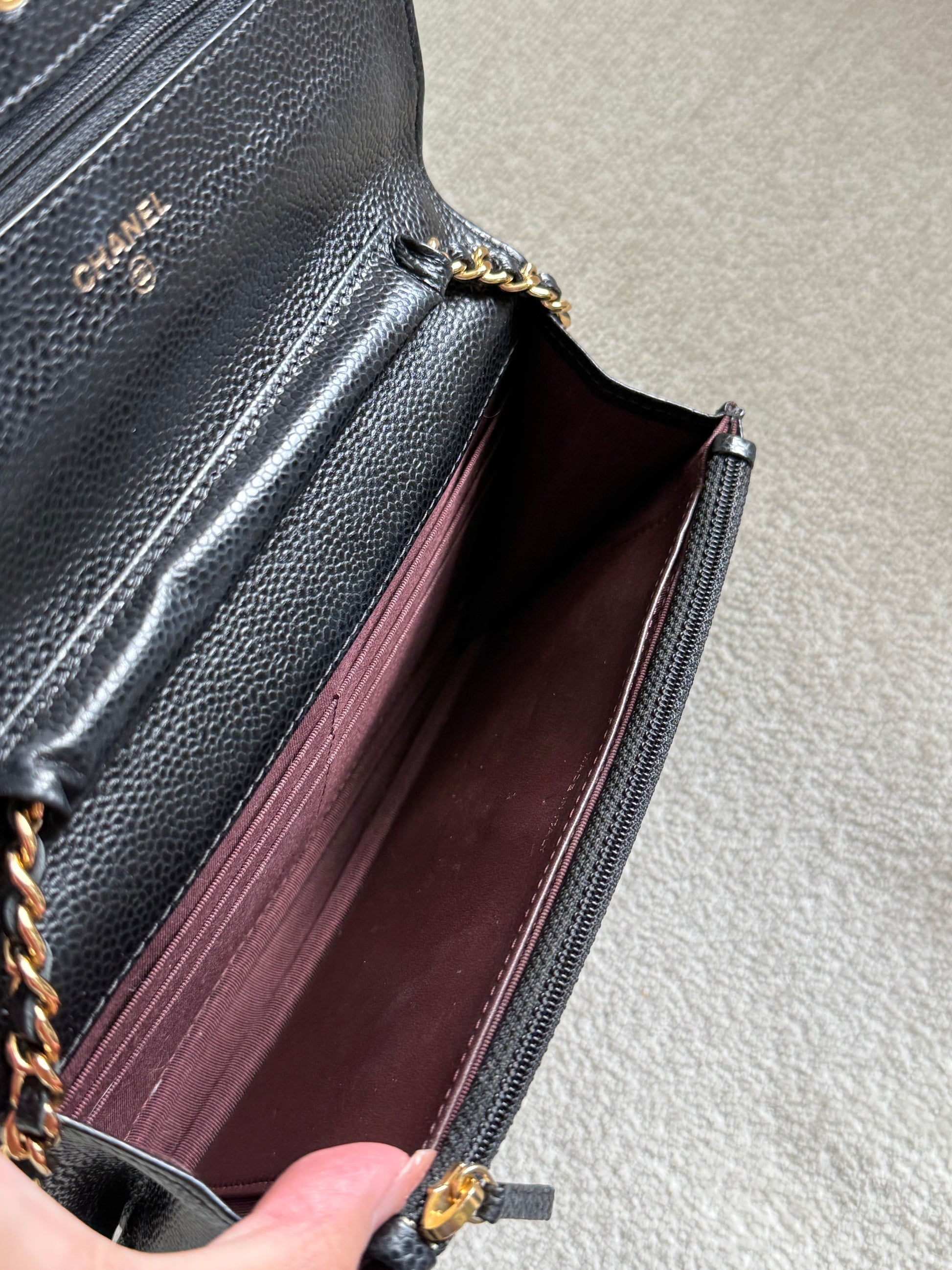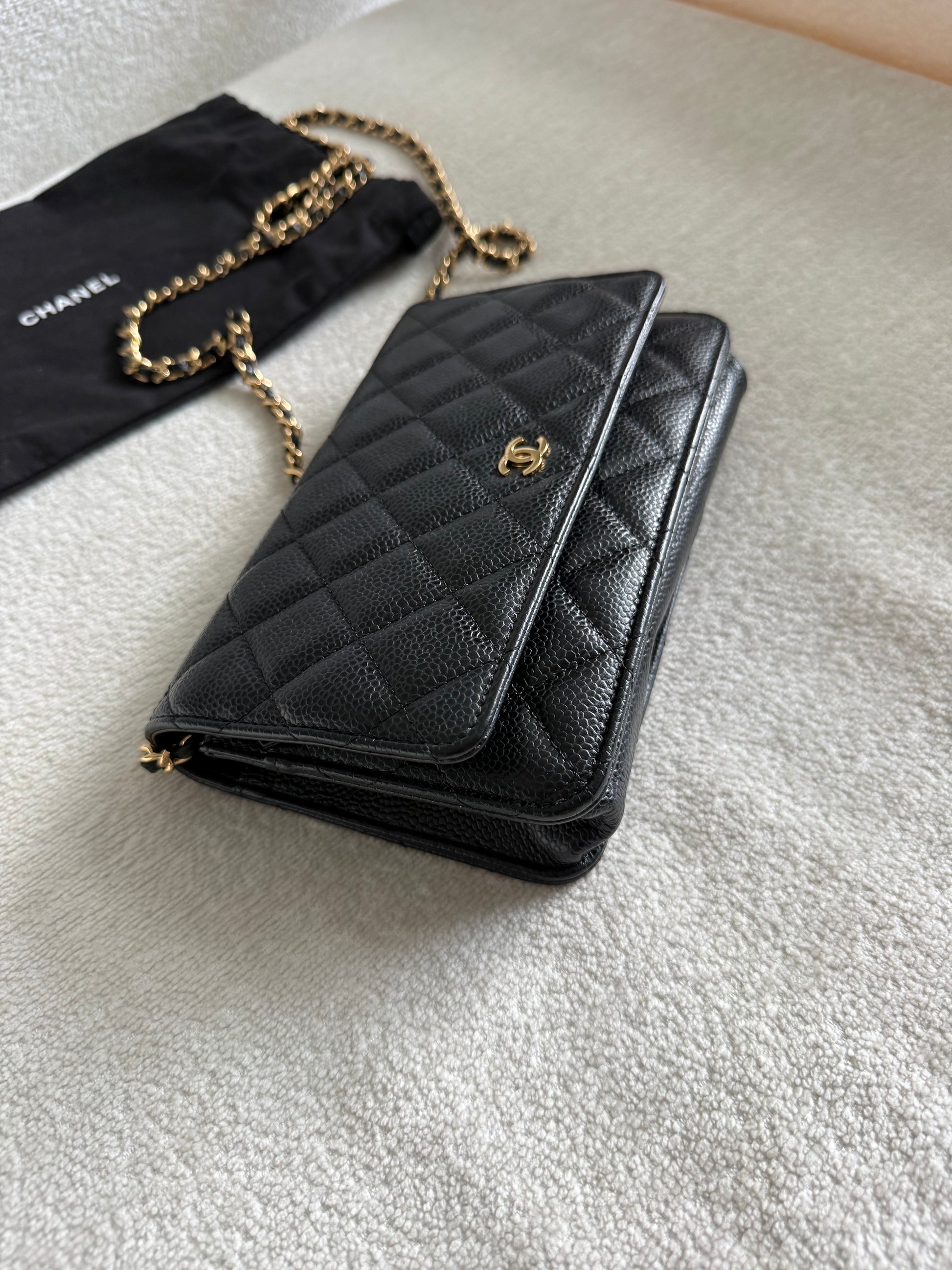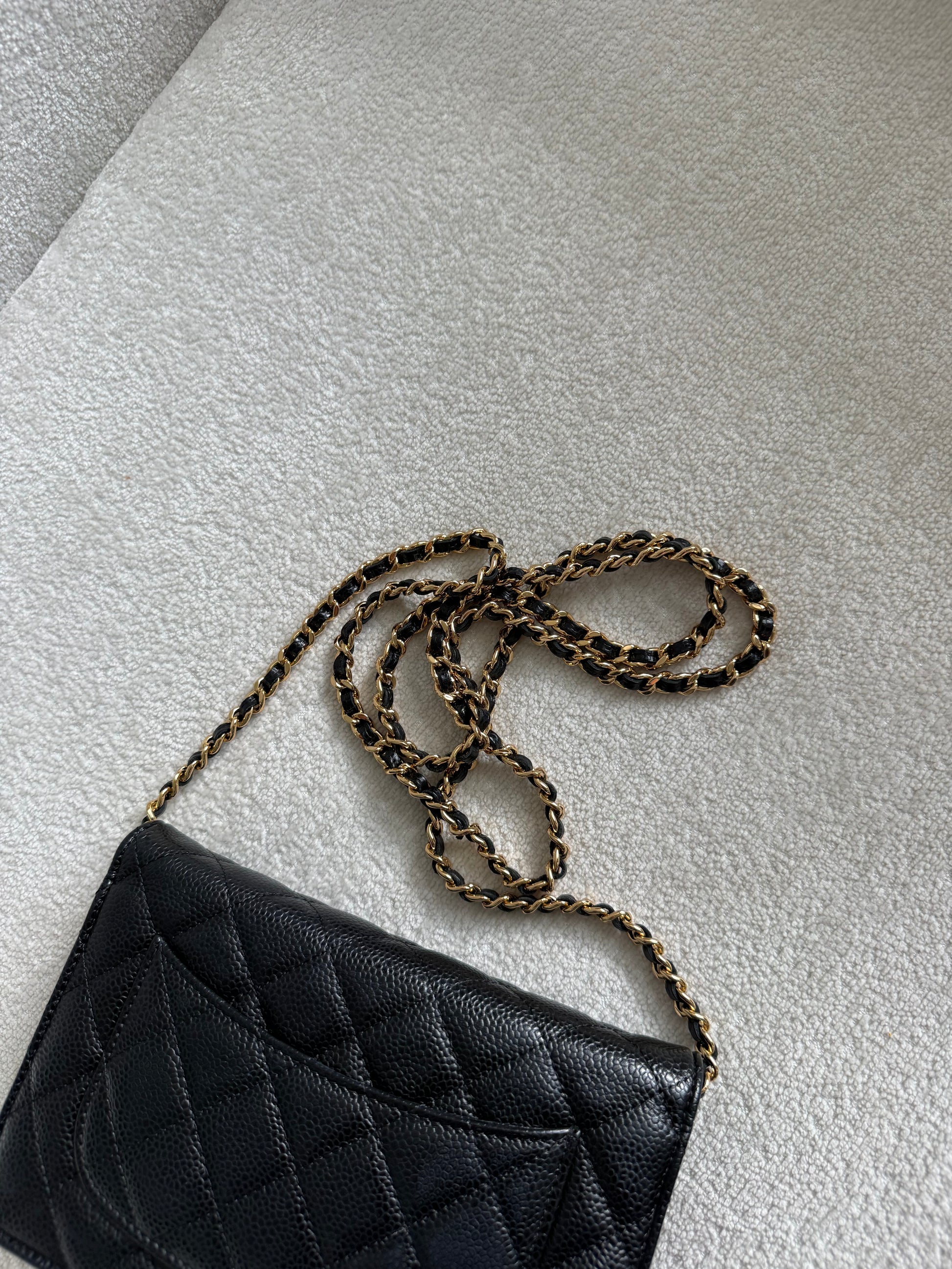 A timeless classic from Chanel, this Wallet on Chain (WOC) is crafted in luxurious black caviar leather and finished with elegant gold-tone hardware. The perfect blend of practicality and sophistication, this piece transitions effortlessly from day to night.