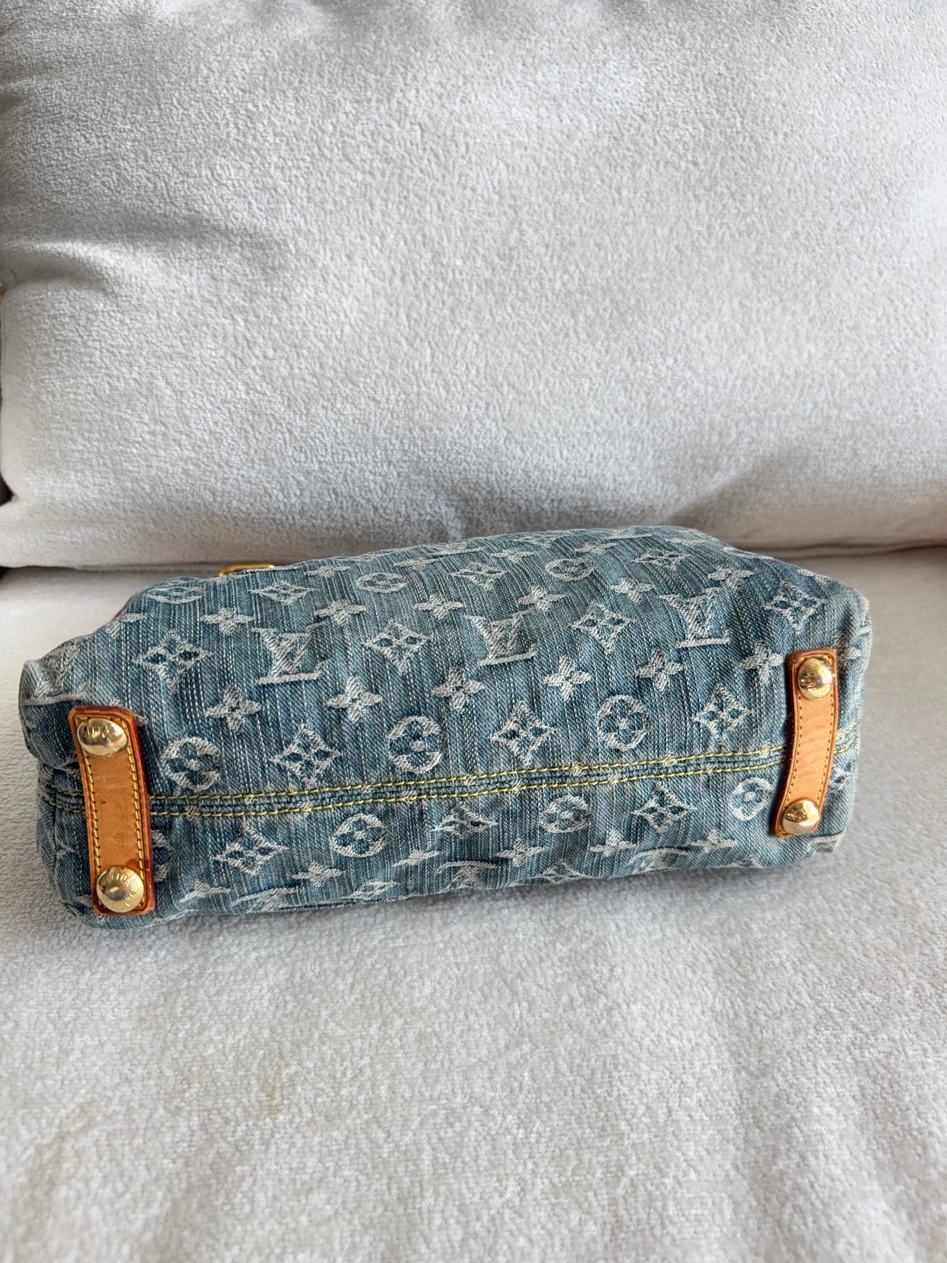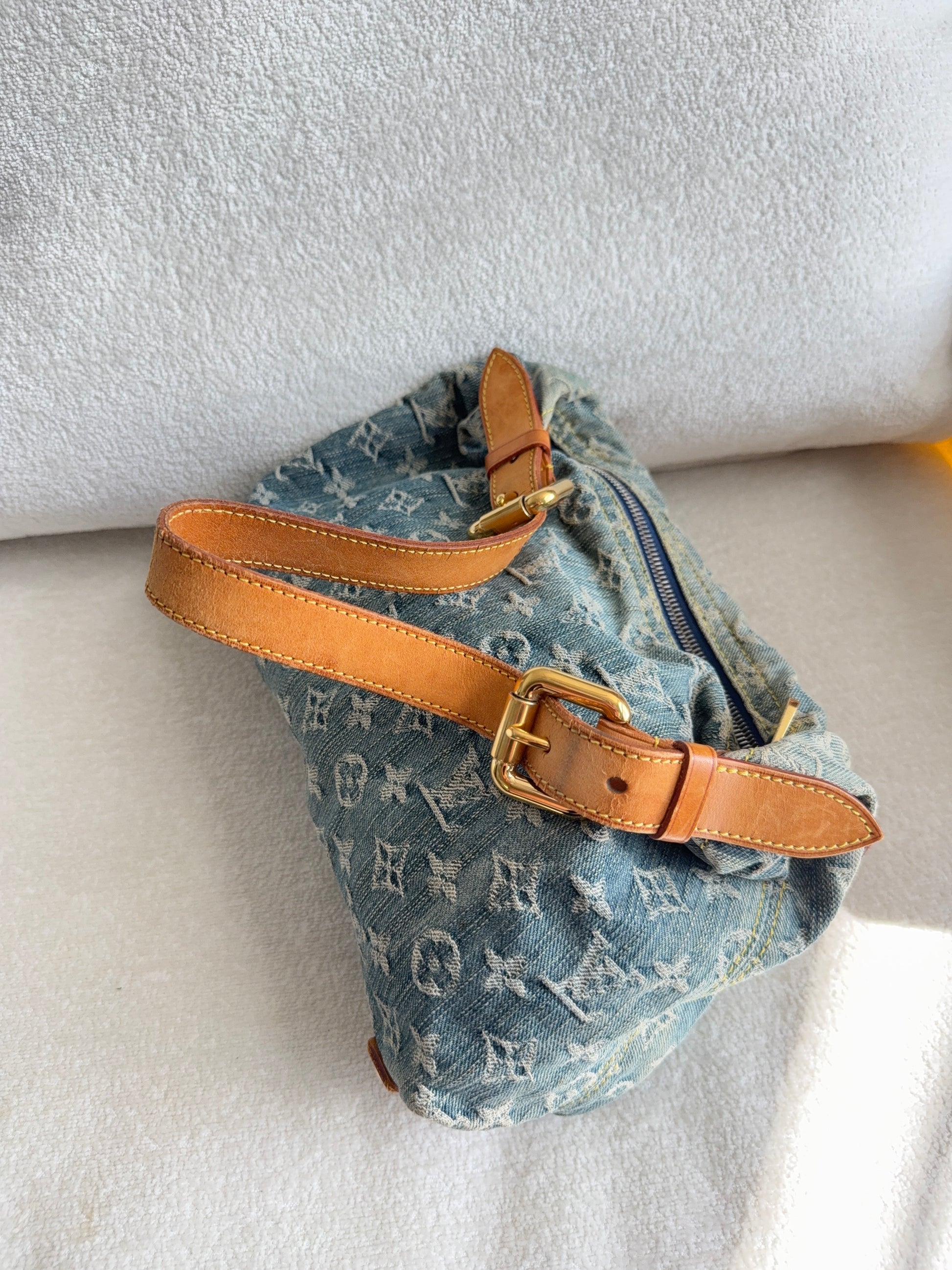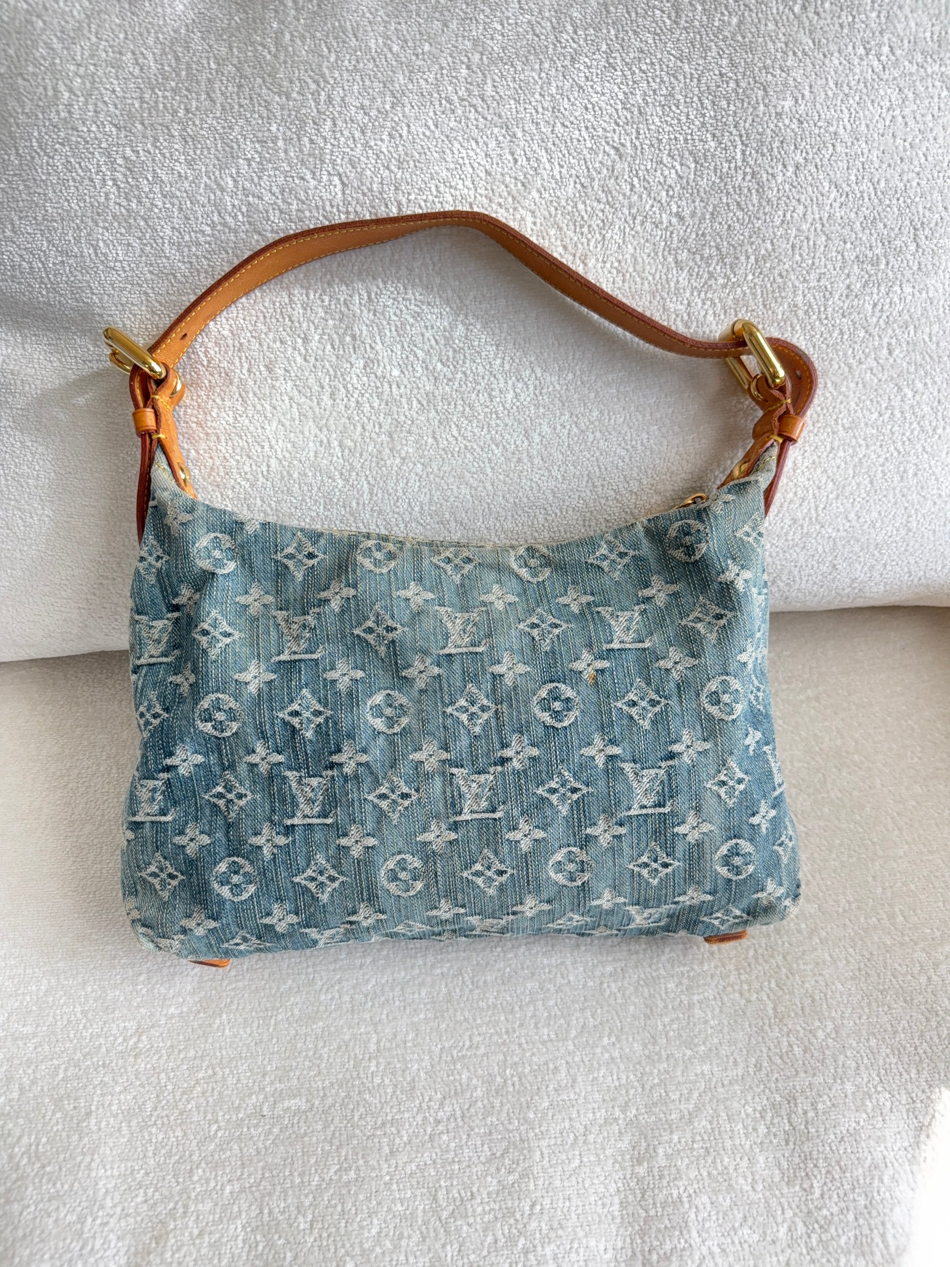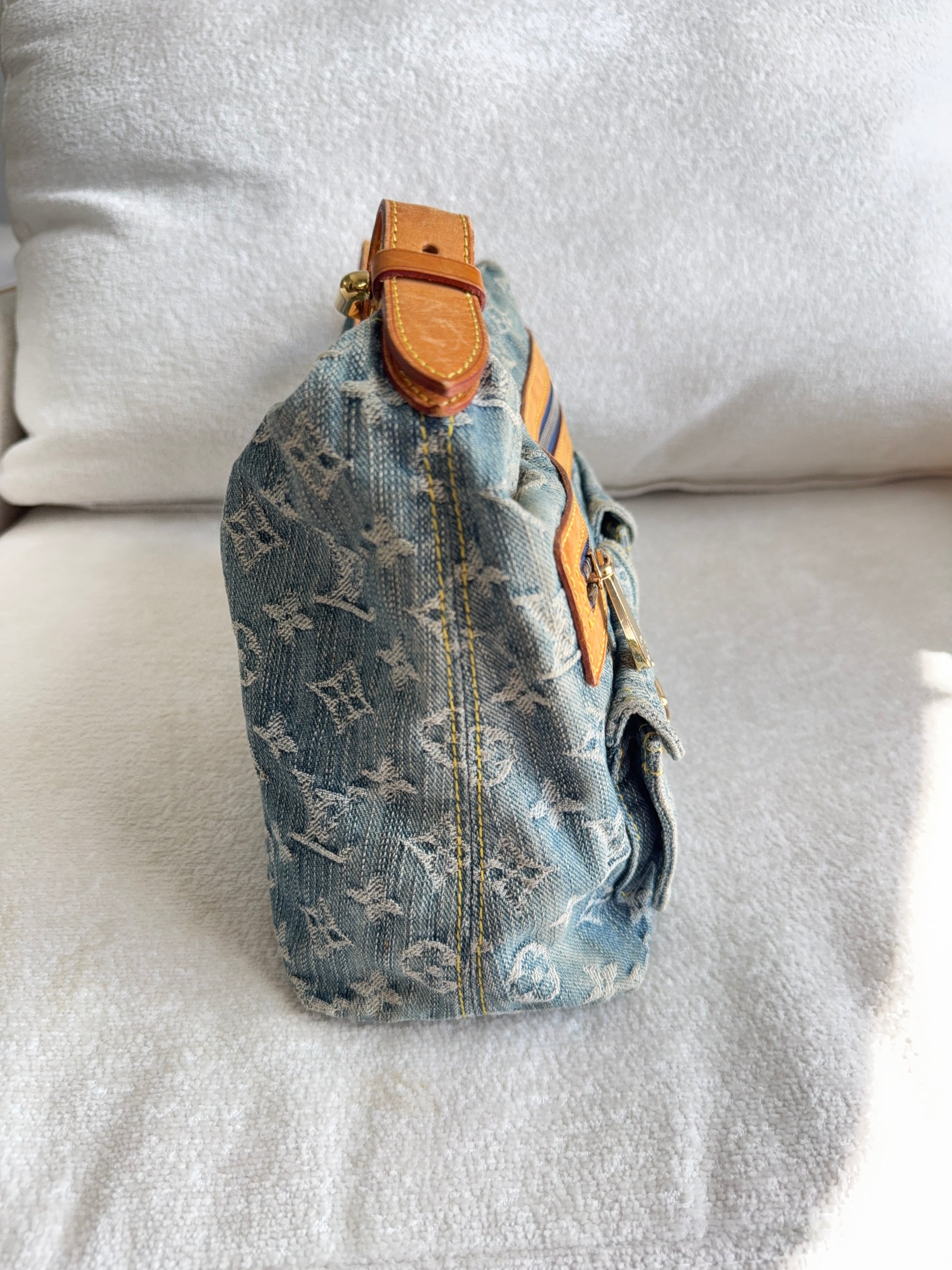 This authentic Louis Vuitton Baggy PM is a stylish shoulder bag crafted in Monogram Denim Canvas with Vachetta leather trim. Made in France in August 2006 (Date Code: TH0896), it’s a perfect blend of casual and chic.