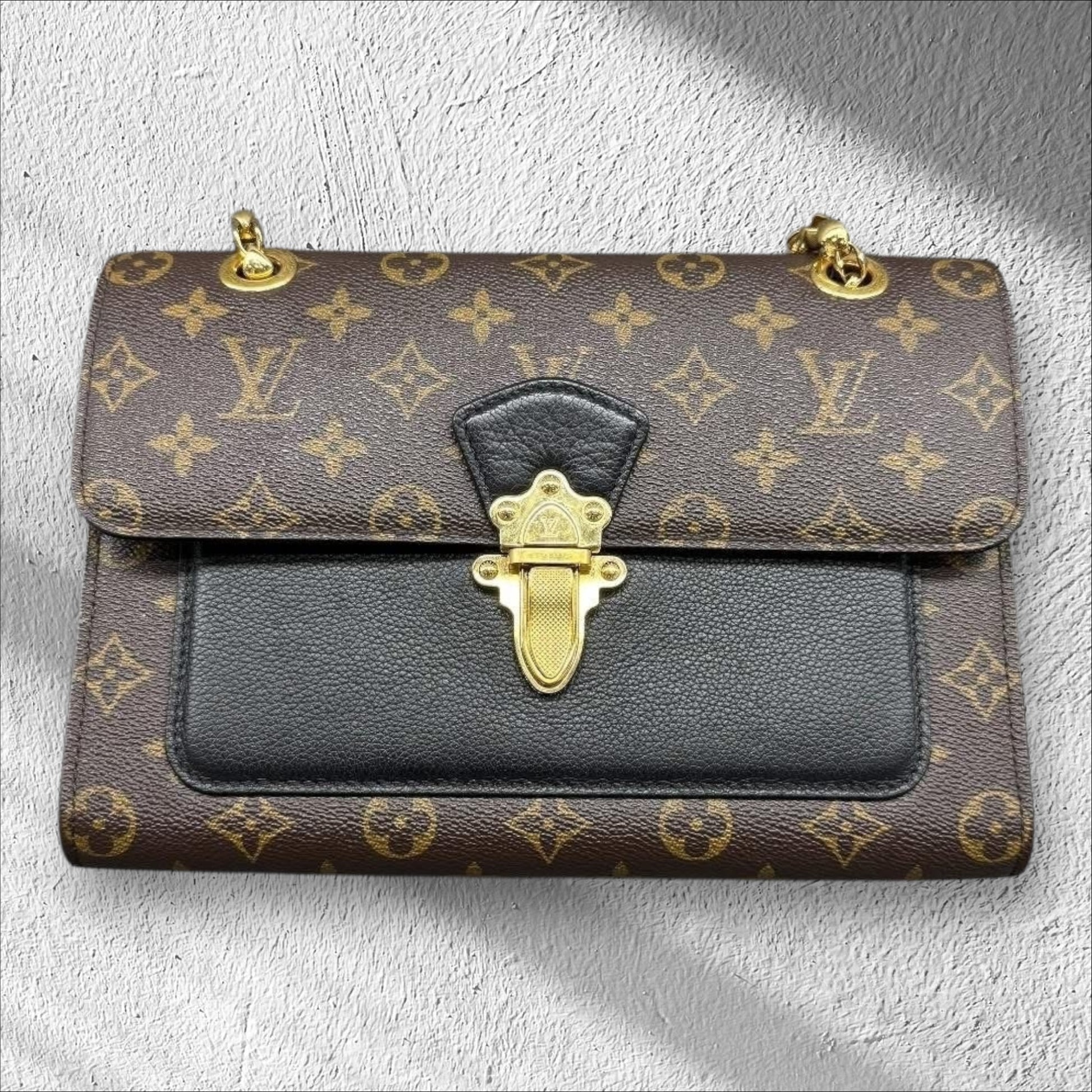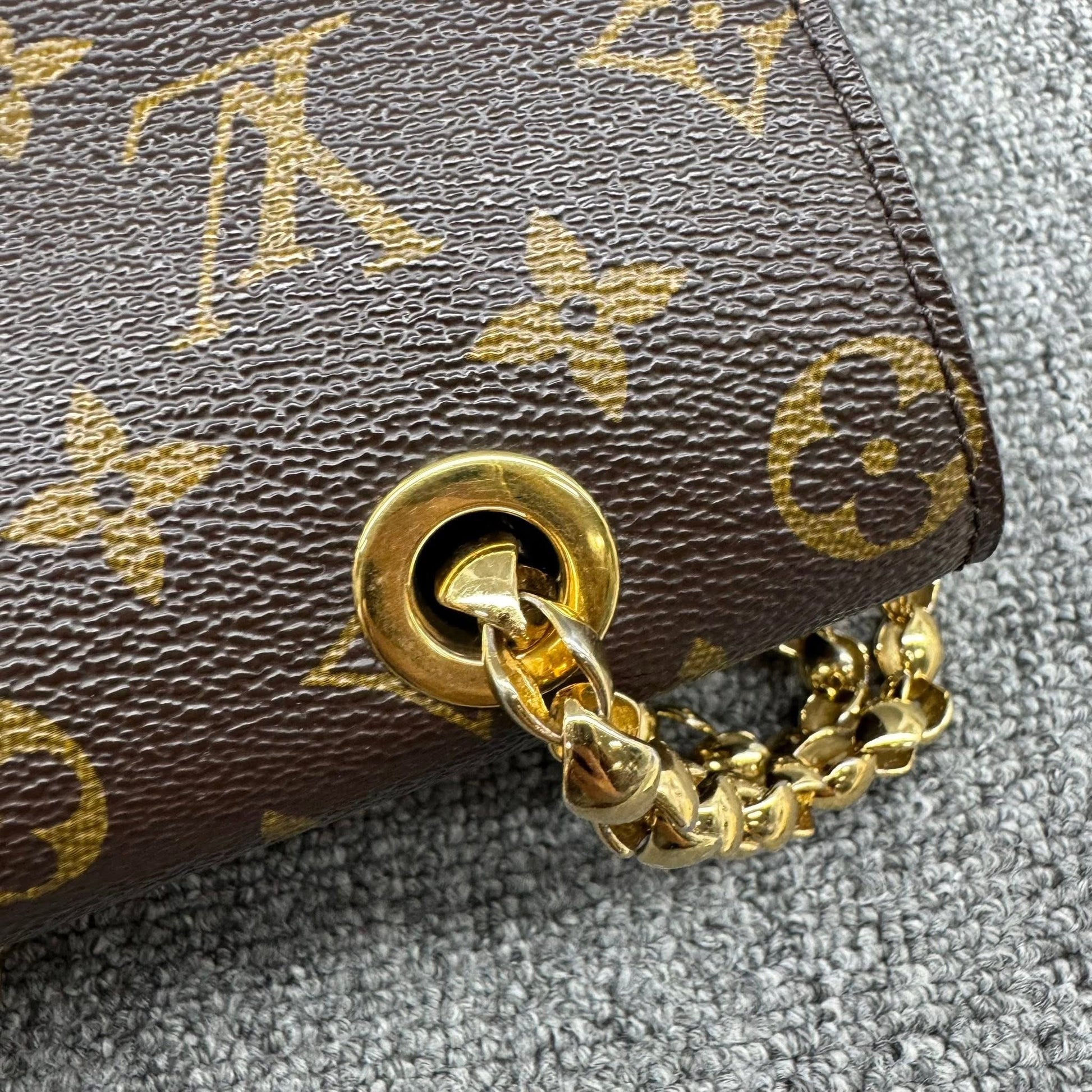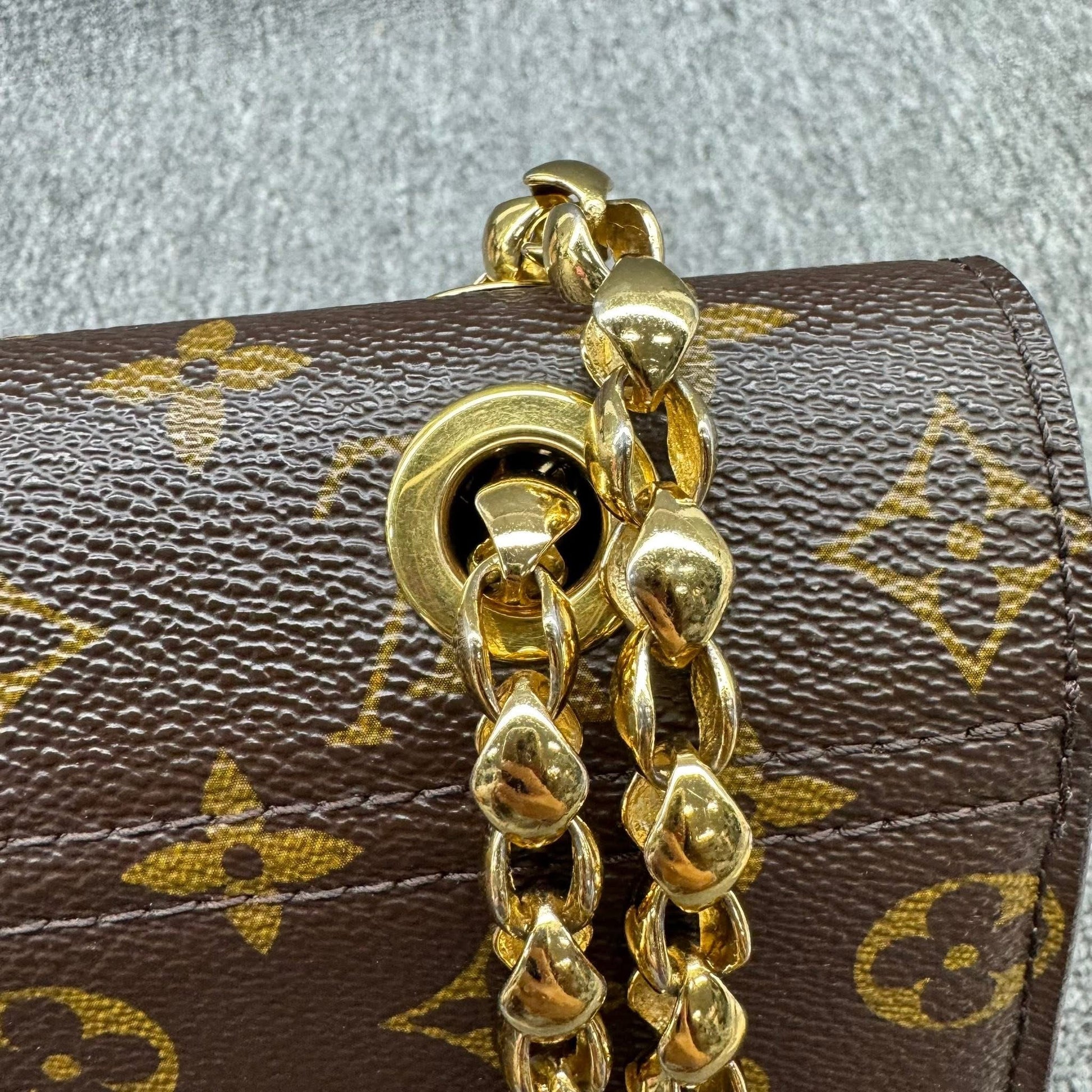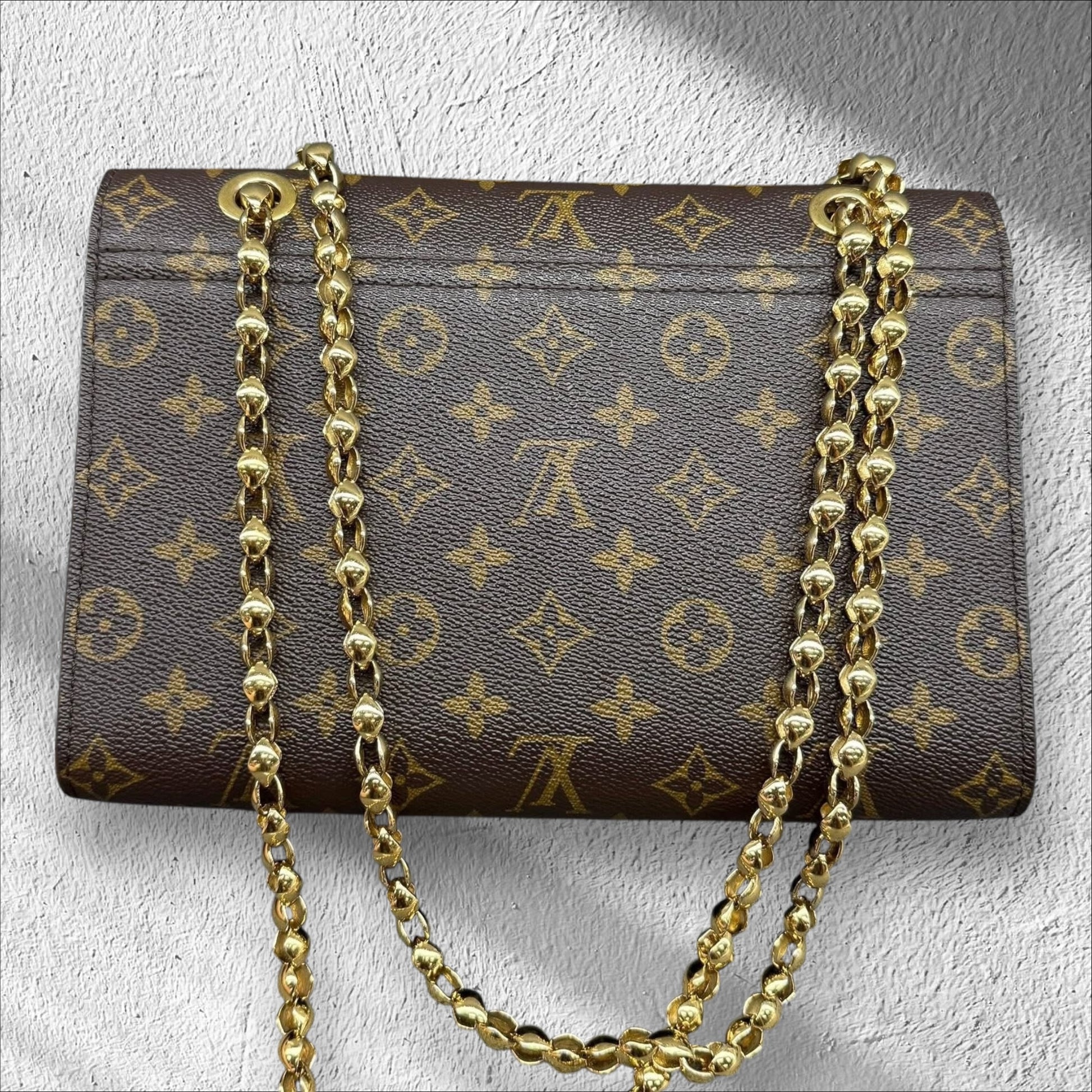 Elevate your collection with the Louis Vuitton Victoire, a timeless blend of sophistication and practicality. Crafted from the iconic Monogram canvas with luxurious black leather accents, this bag features a striking gold-tone push-lock clasp and a chic chain strap that can be worn on the shoulder or crossbody.