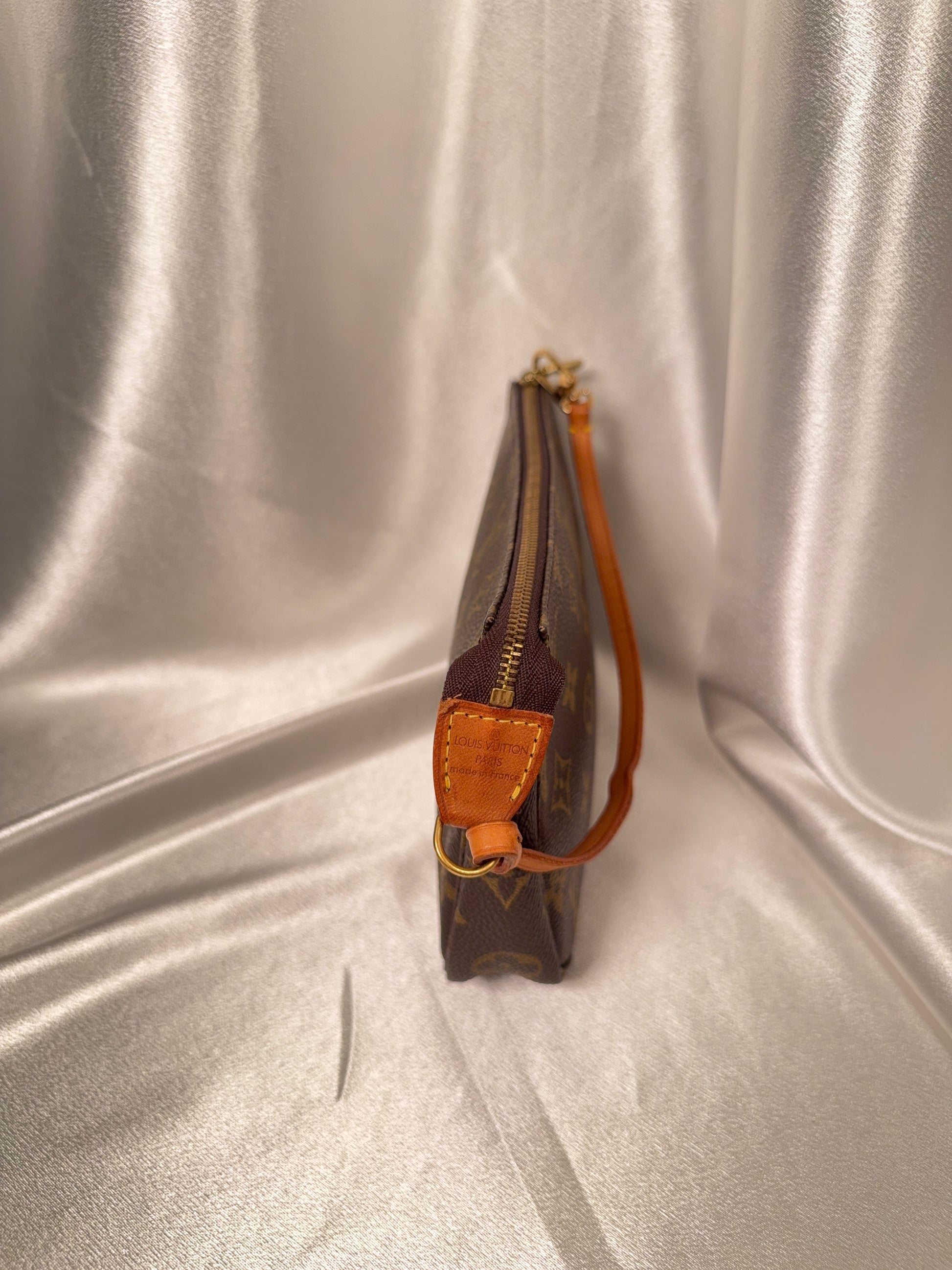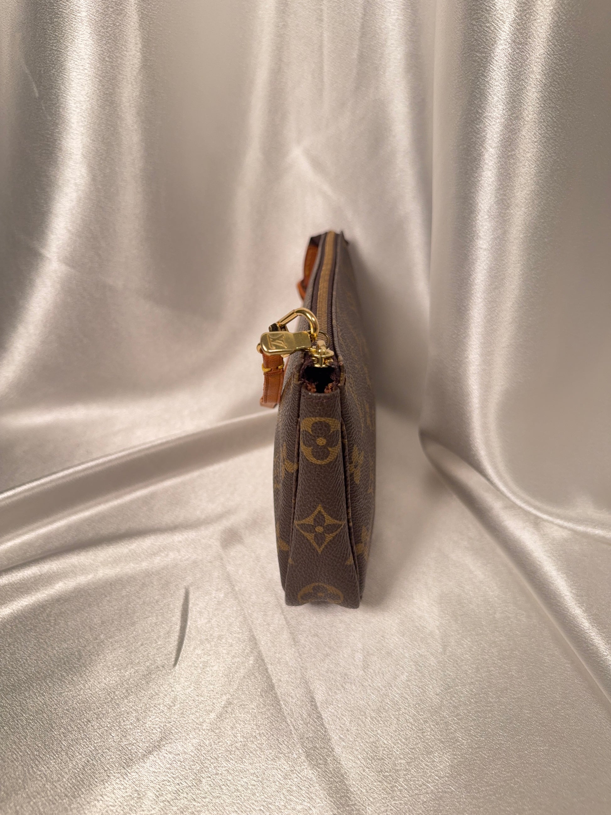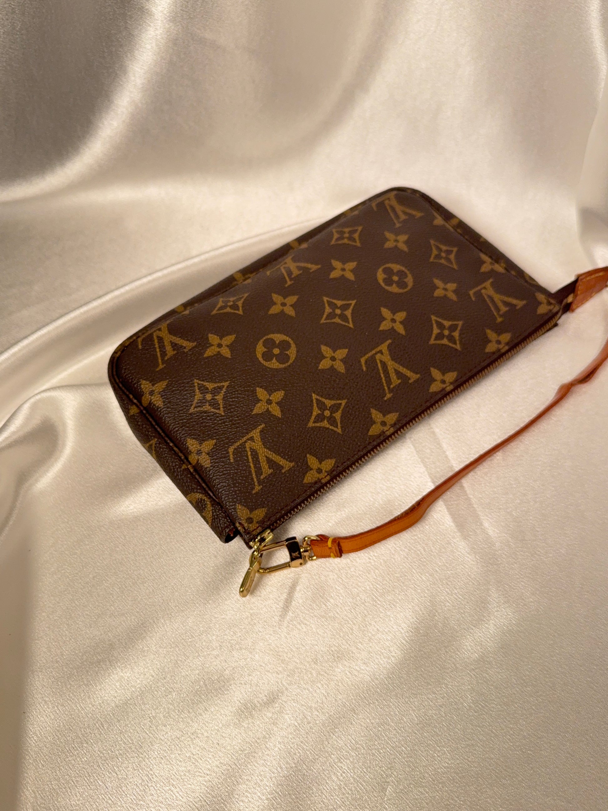 Elevate your wardrobe with the iconic Louis Vuitton Monogram Pochette Accessoires, a classic piece beloved by collectors and fashion enthusiasts alike. This timeless vintage accessory features the house’s signature monogram canvas, natural cowhide leather strap, and gold-tone hardware—perfectly compact and endlessly chic.