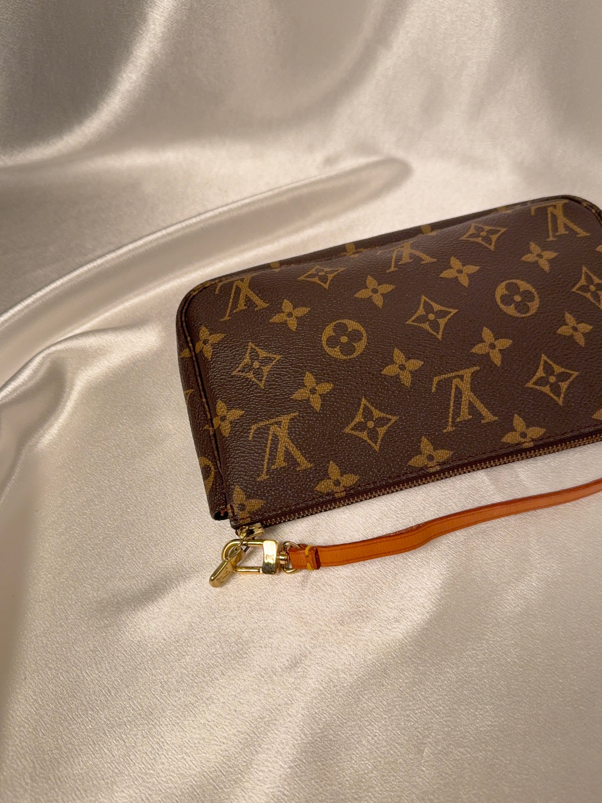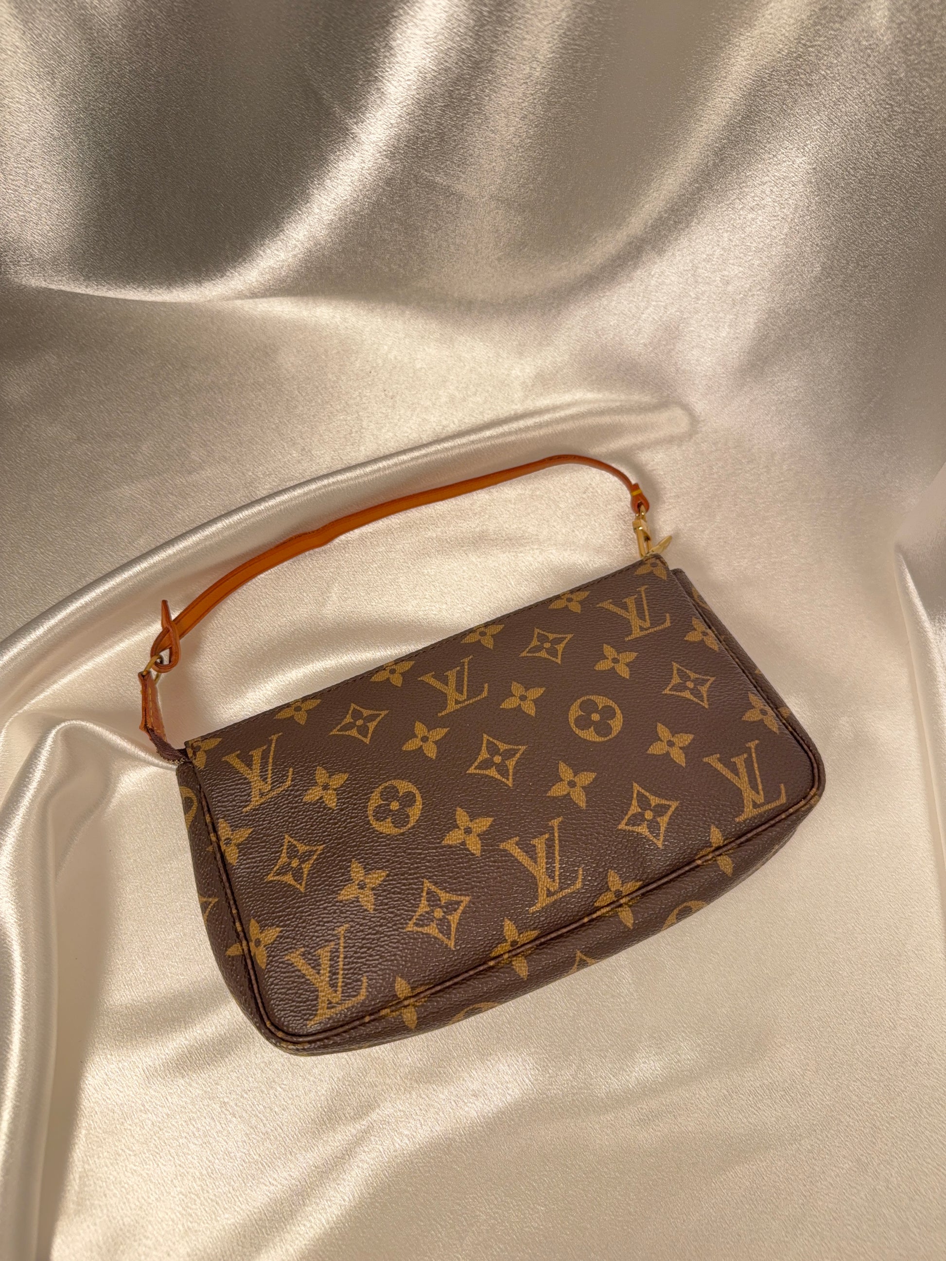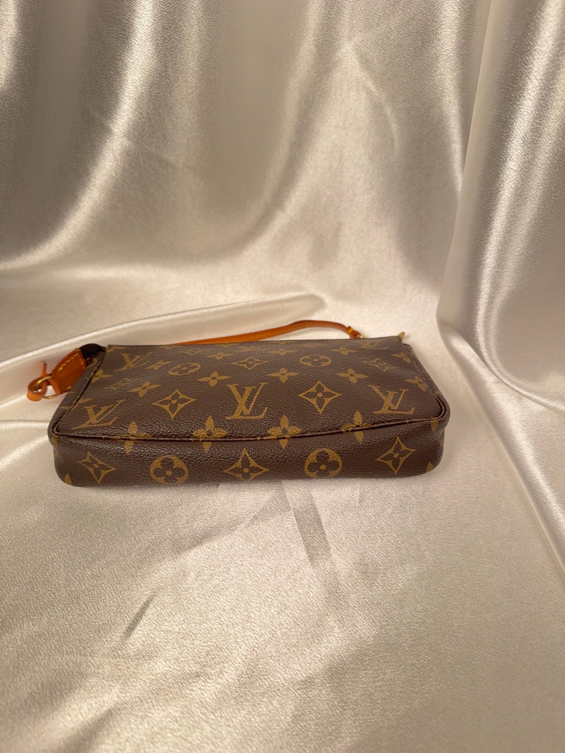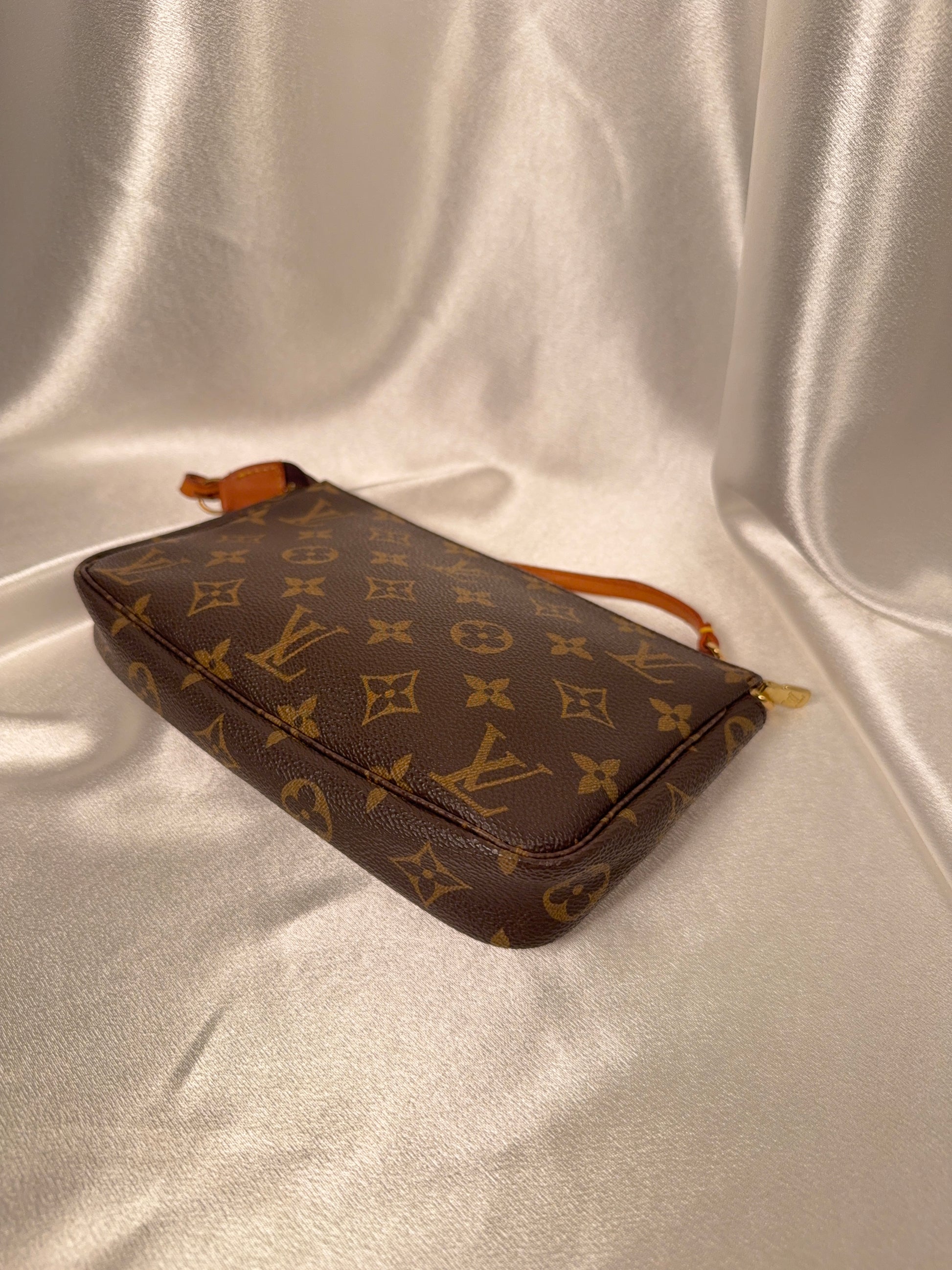 Elevate your wardrobe with the iconic Louis Vuitton Monogram Pochette Accessoires, a classic piece beloved by collectors and fashion enthusiasts alike. This timeless vintage accessory features the house’s signature monogram canvas, natural cowhide leather strap, and gold-tone hardware—perfectly compact and endlessly chic.